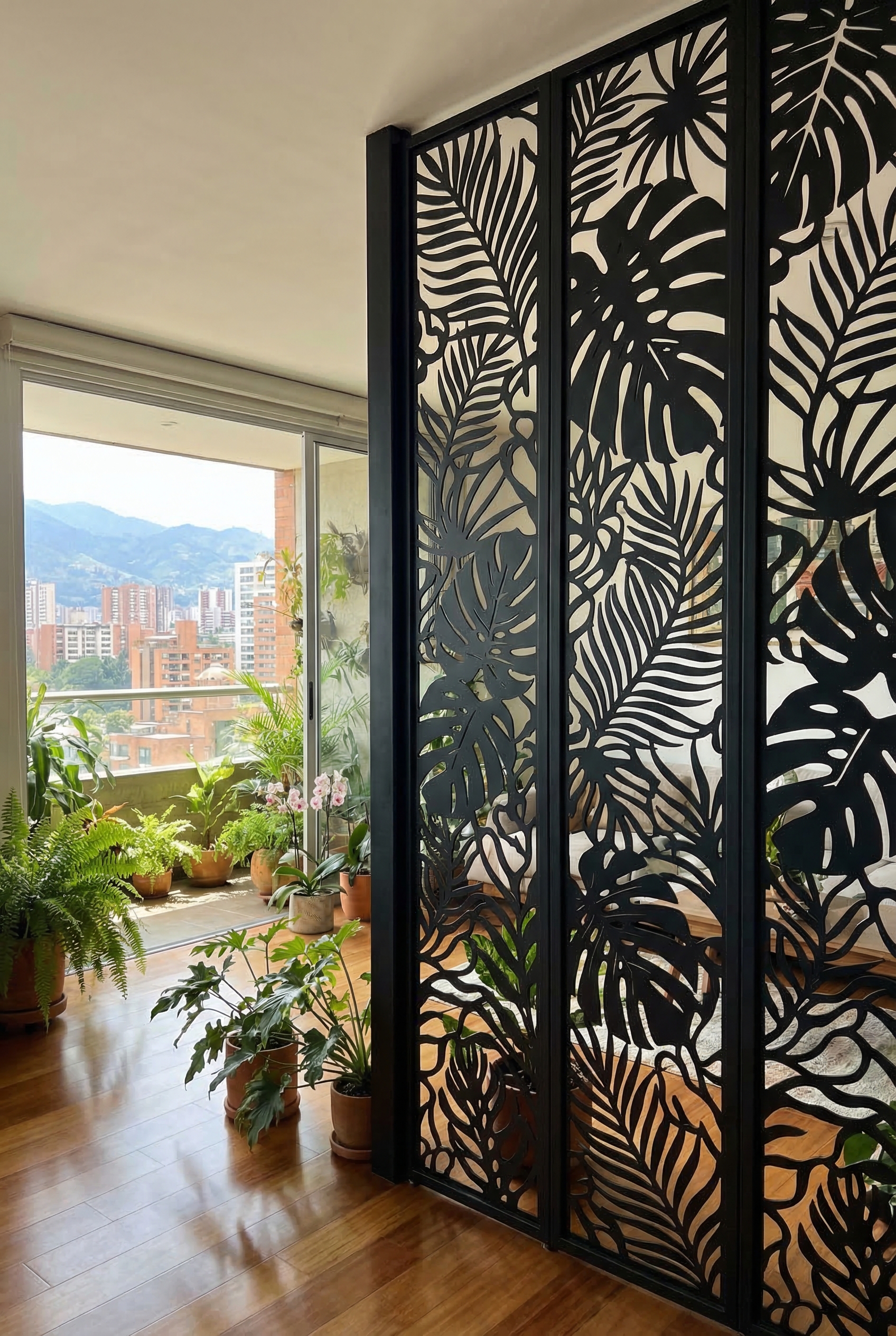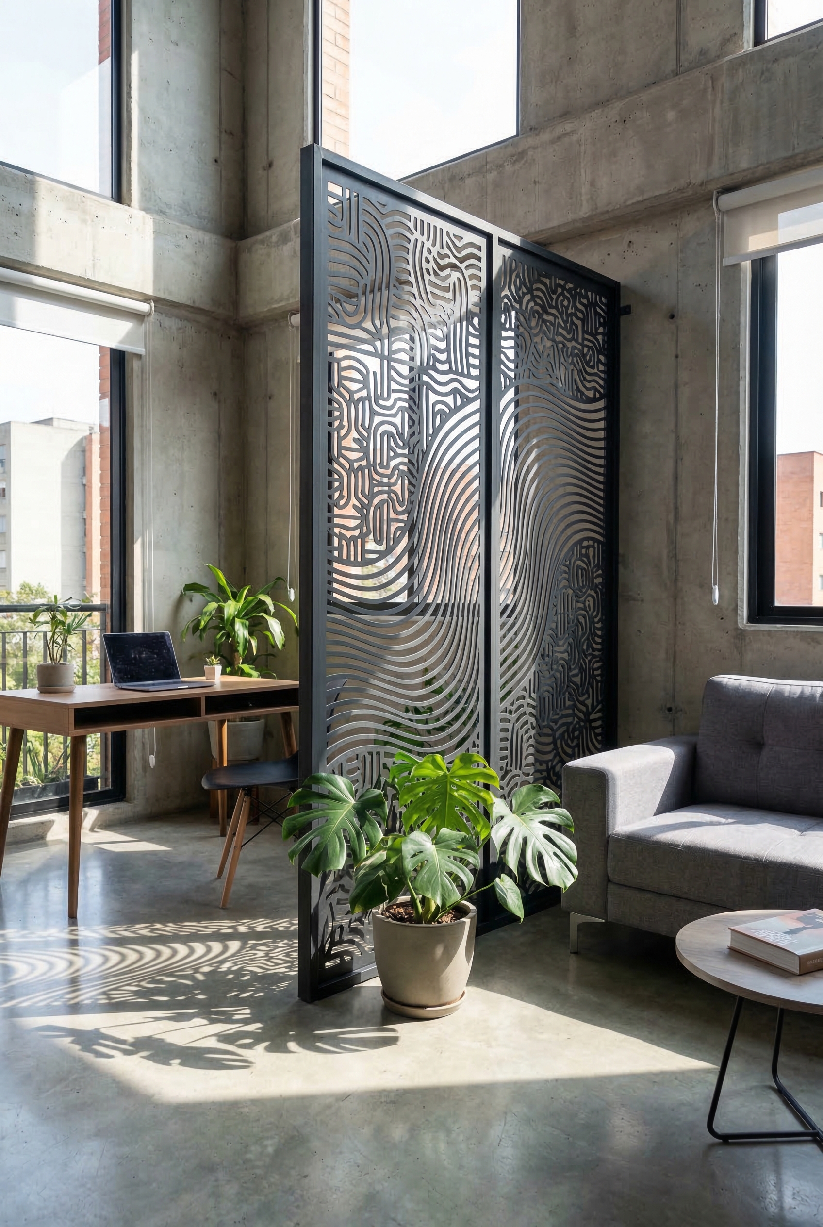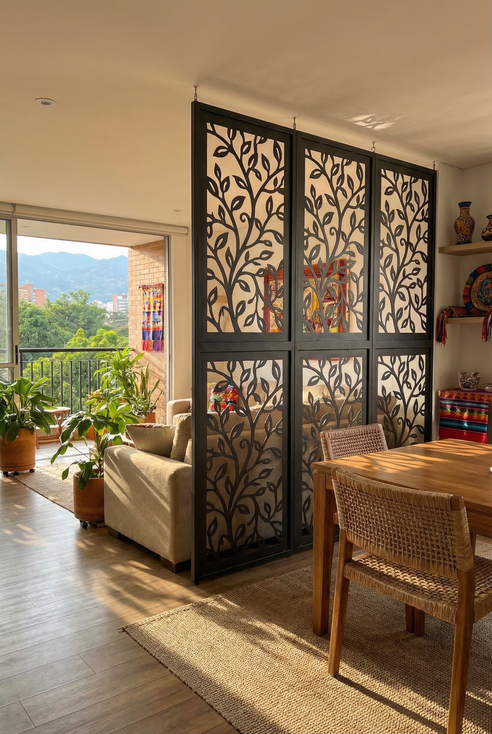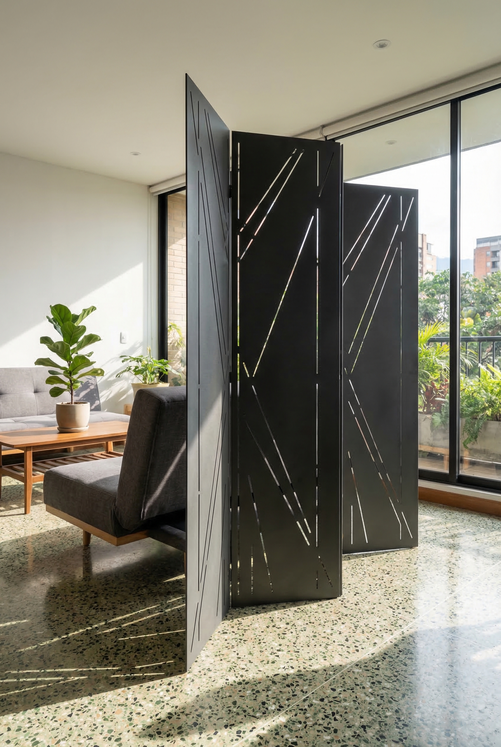 Los biombos y separadores metálicos permiten transformar los espacios sin necesidad de muros permanentes. Diseñamos y fabricamos paneles con patrones de corte láser únicos, inspirados en geometría, naturaleza y arte contemporáneo, que filtran la luz y crean juegos de sombras elegantes. Estas piezas funcionan como elementos arquitectónicos y decorativos que aportan identidad a hogares, oficinas, restaurantes y proyectos comerciales.