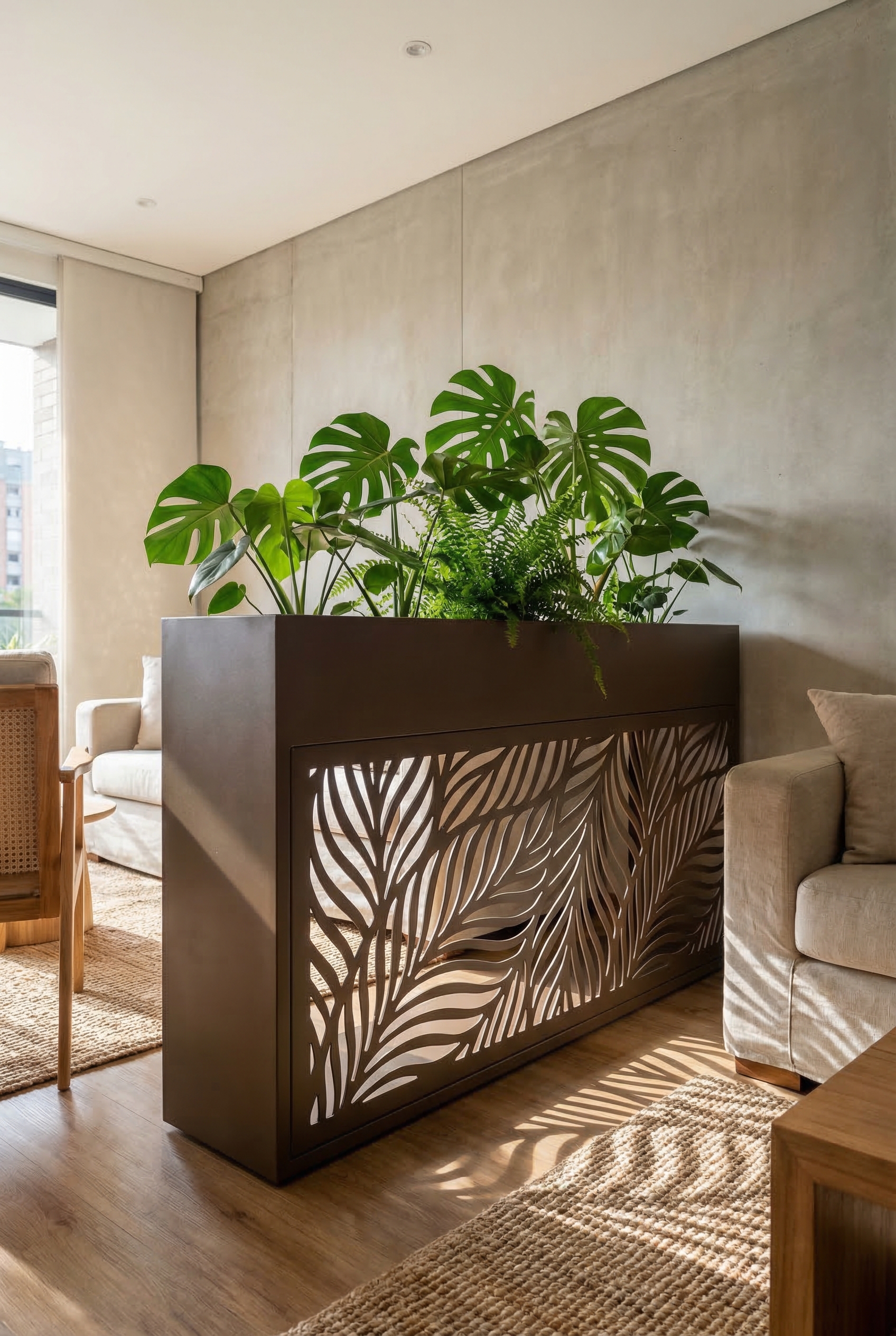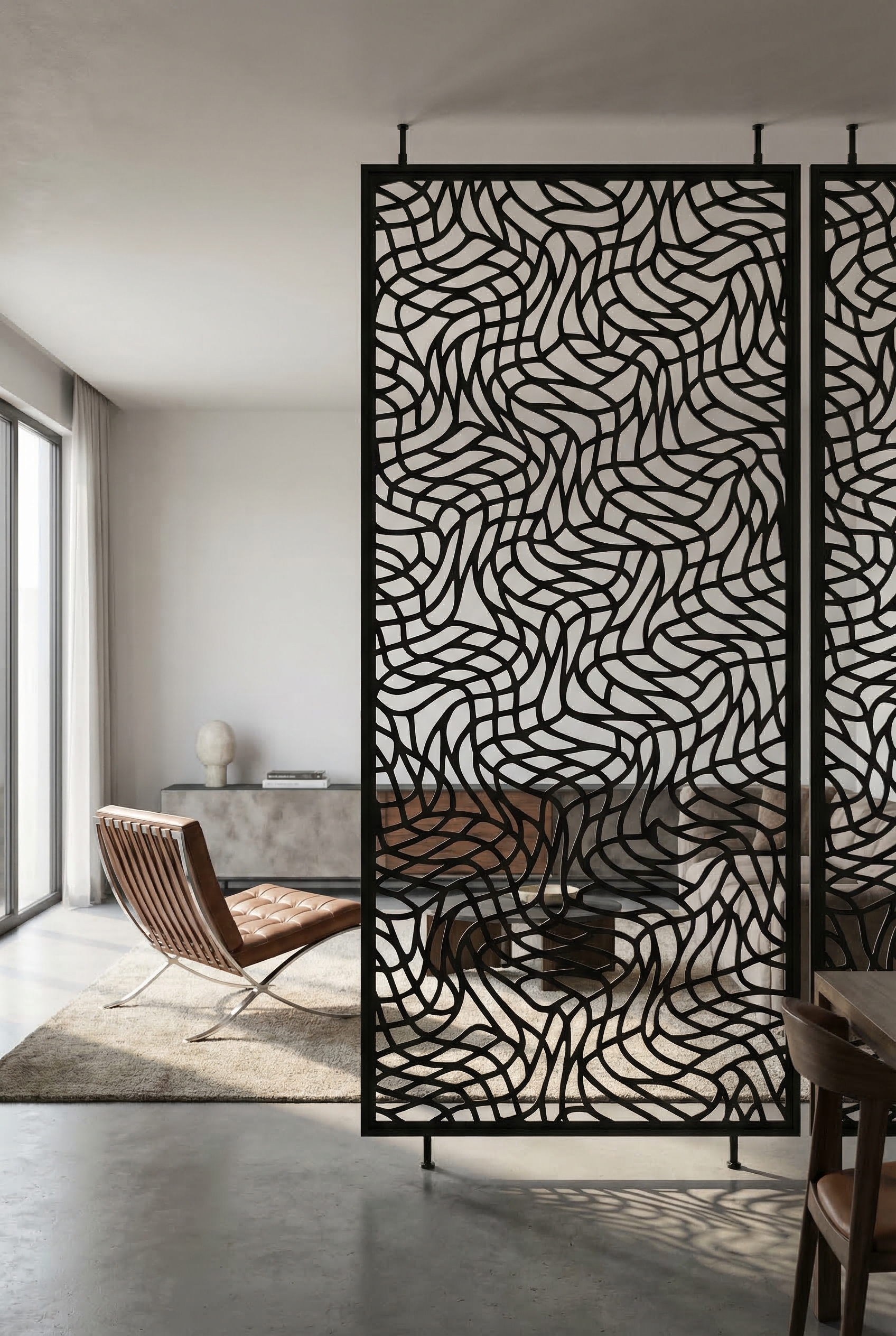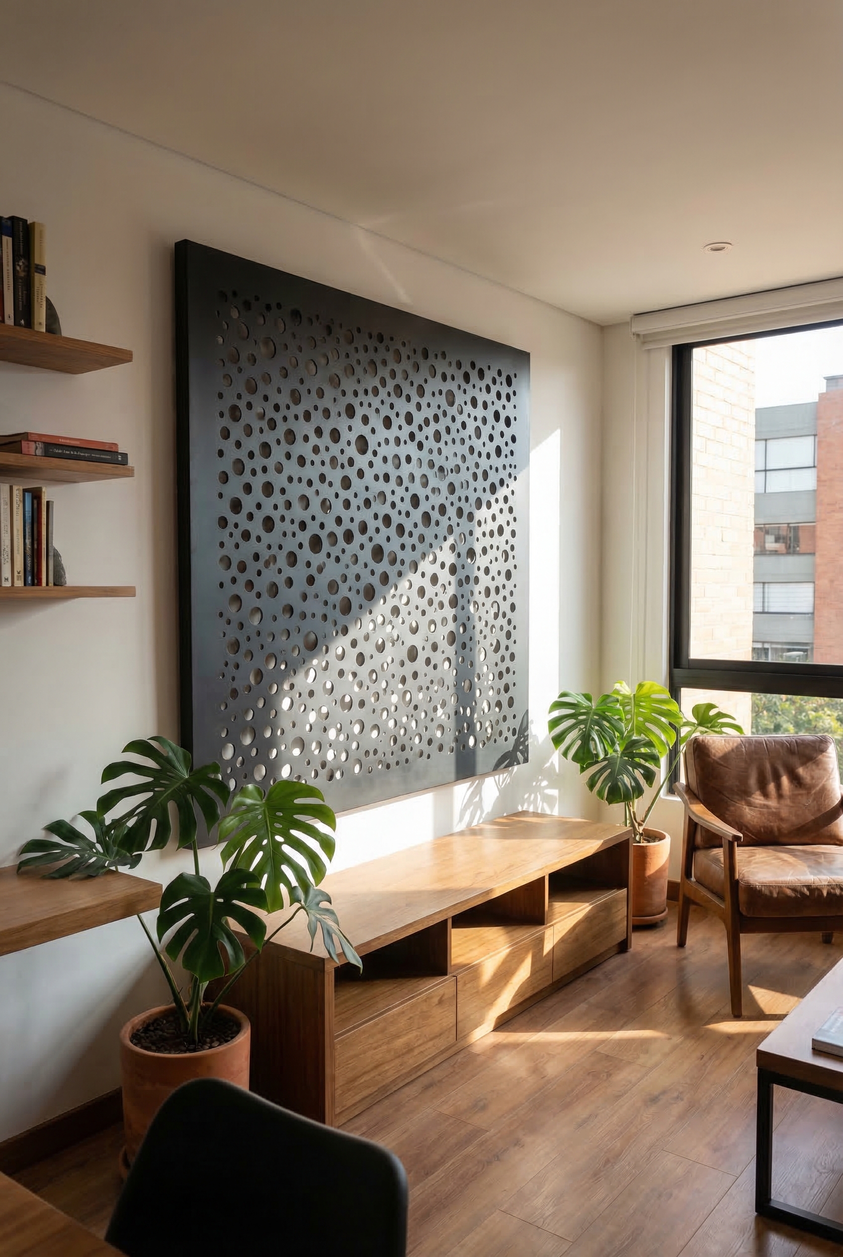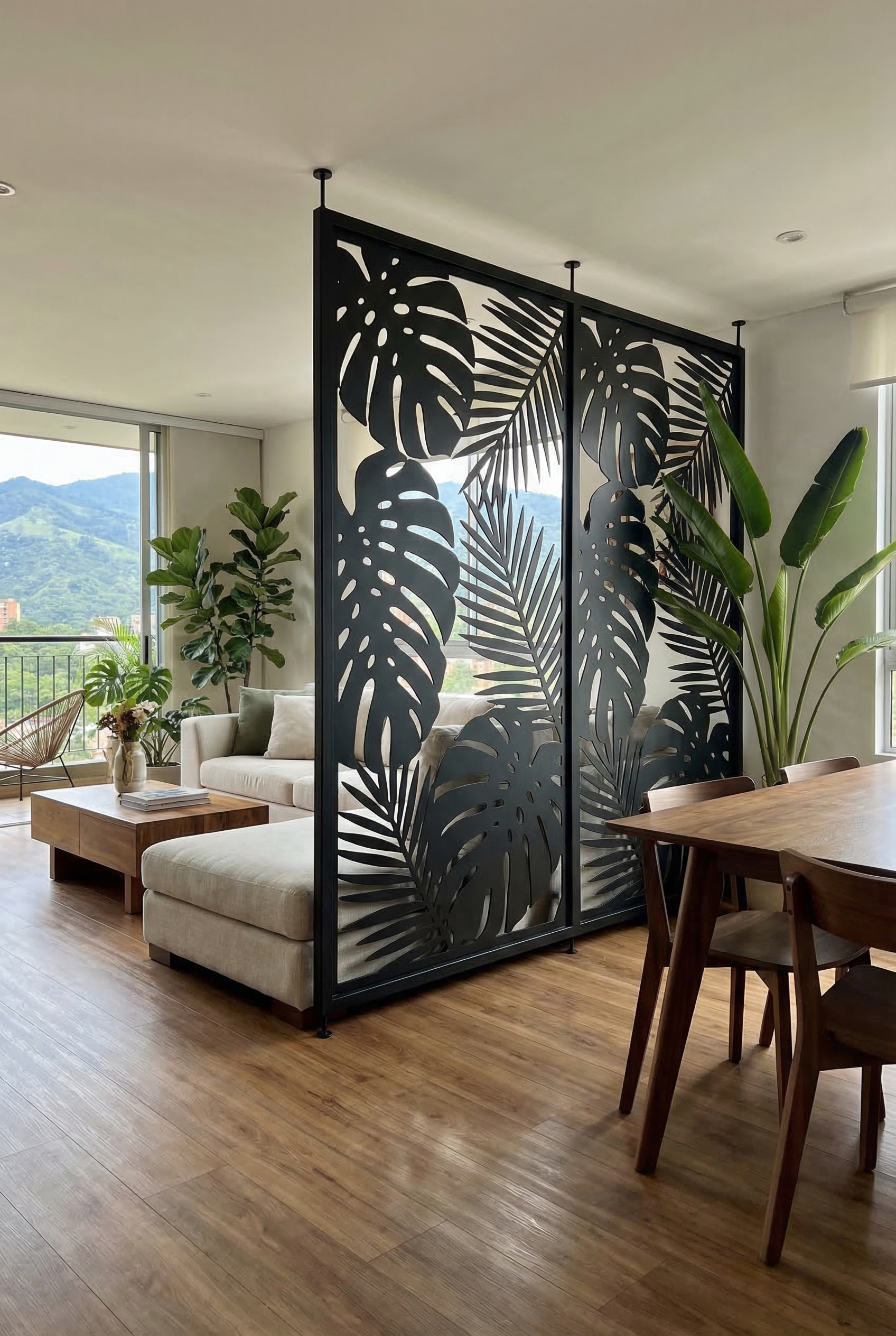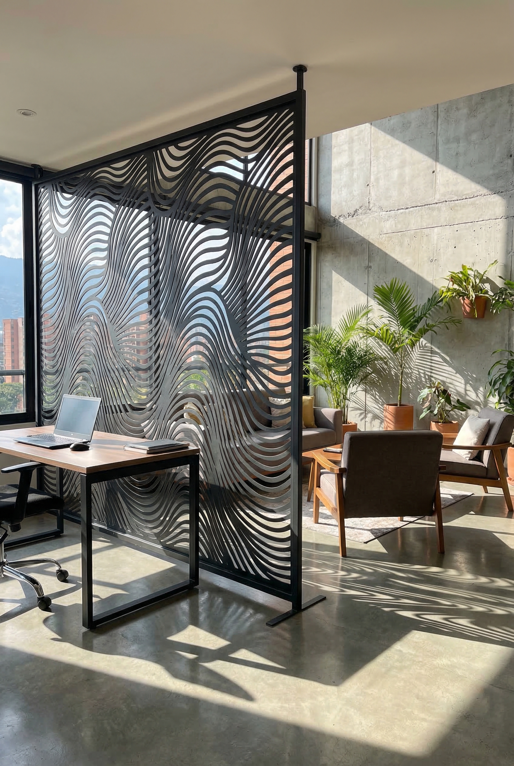 Los biombos y separadores metálicos permiten transformar los espacios sin necesidad de muros permanentes. Diseñamos y fabricamos paneles con patrones de corte láser únicos, inspirados en geometría, naturaleza y arte contemporáneo, que filtran la luz y crean juegos de sombras elegantes. Estas piezas funcionan como elementos arquitectónicos y decorativos que aportan identidad a hogares, oficinas, restaurantes y proyectos comerciales.