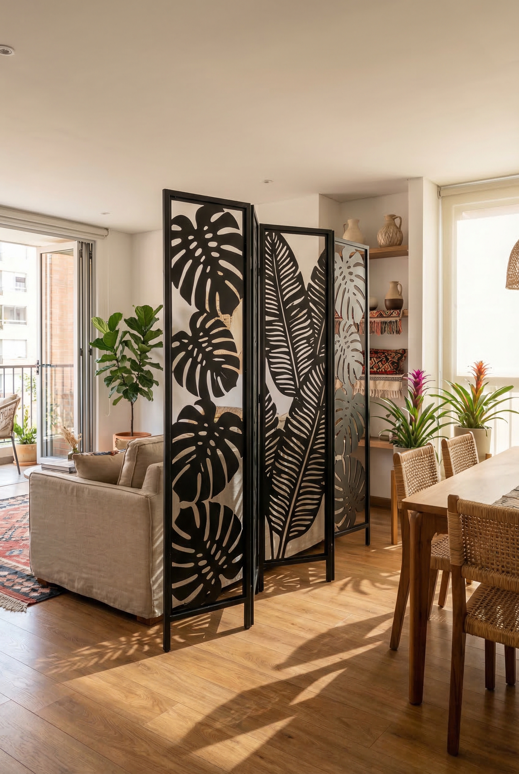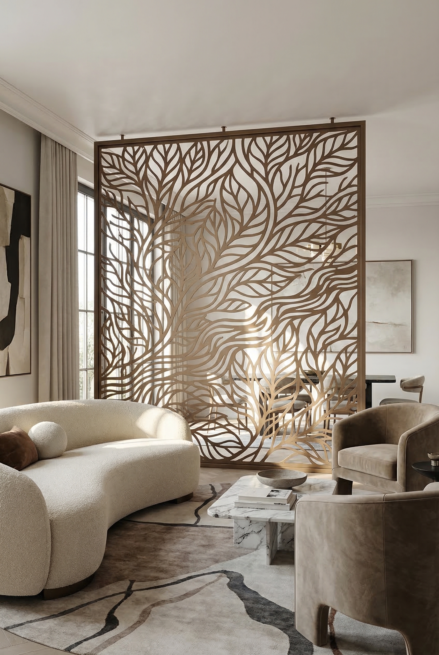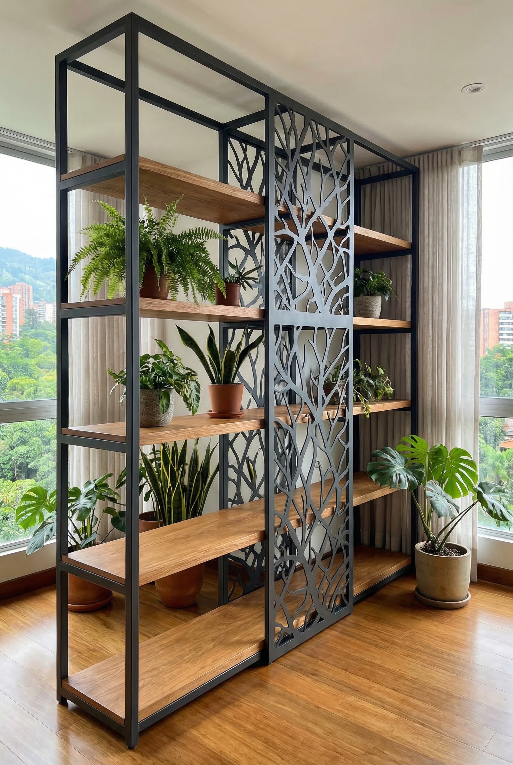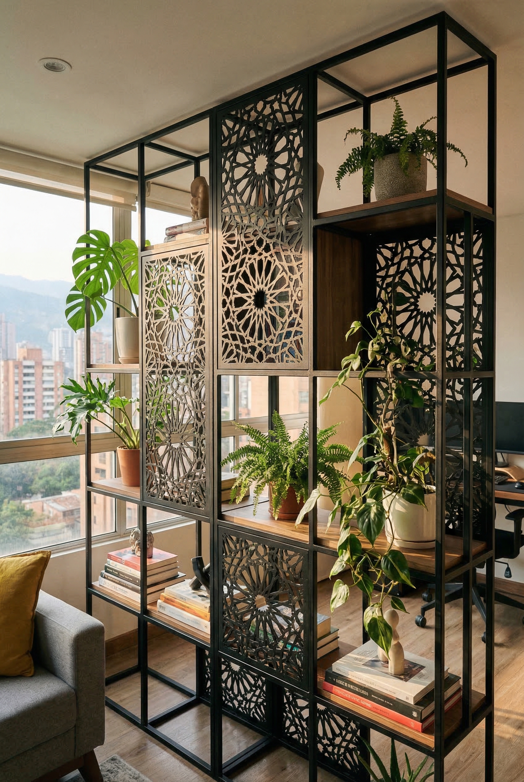 Los biombos y separadores metálicos permiten transformar los espacios sin necesidad de muros permanentes. Diseñamos y fabricamos paneles con patrones de corte láser únicos, inspirados en geometría, naturaleza y arte contemporáneo, que filtran la luz y crean juegos de sombras elegantes. Estas piezas funcionan como elementos arquitectónicos y decorativos que aportan identidad a hogares, oficinas, restaurantes y proyectos comerciales.