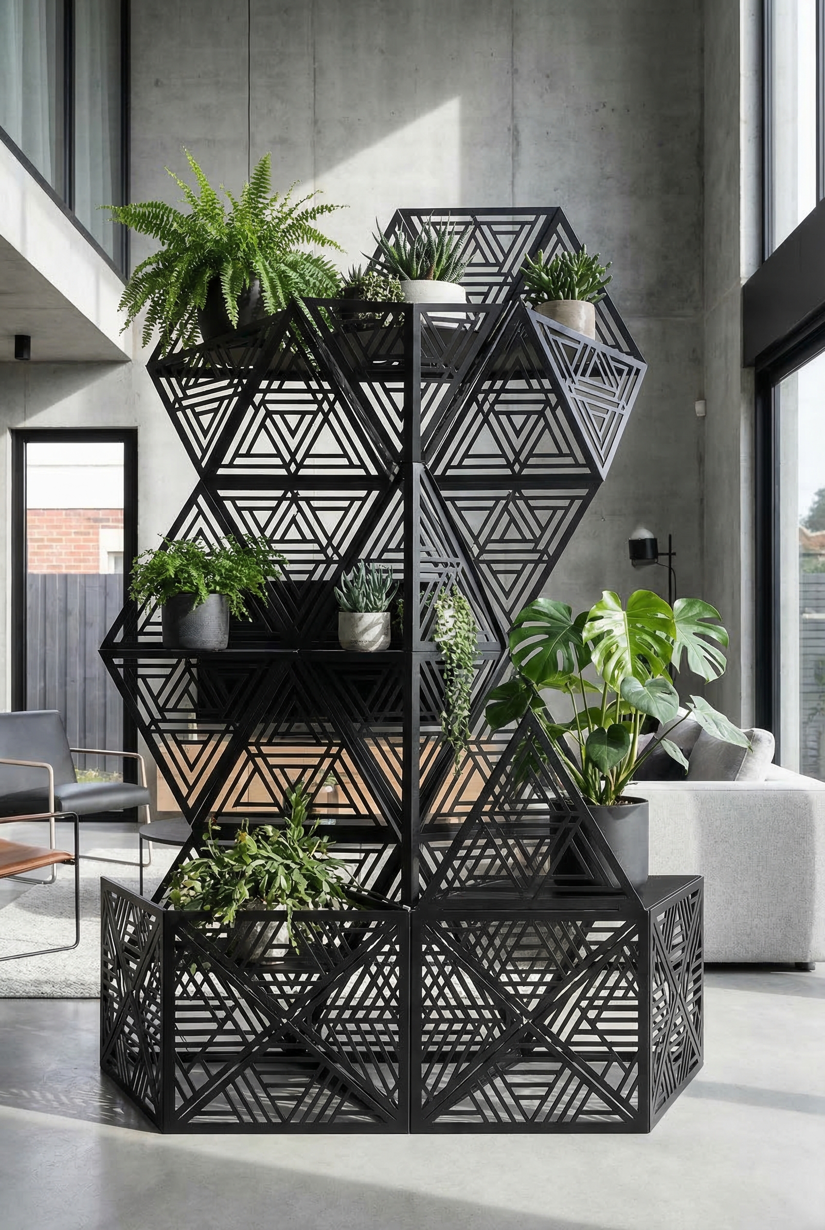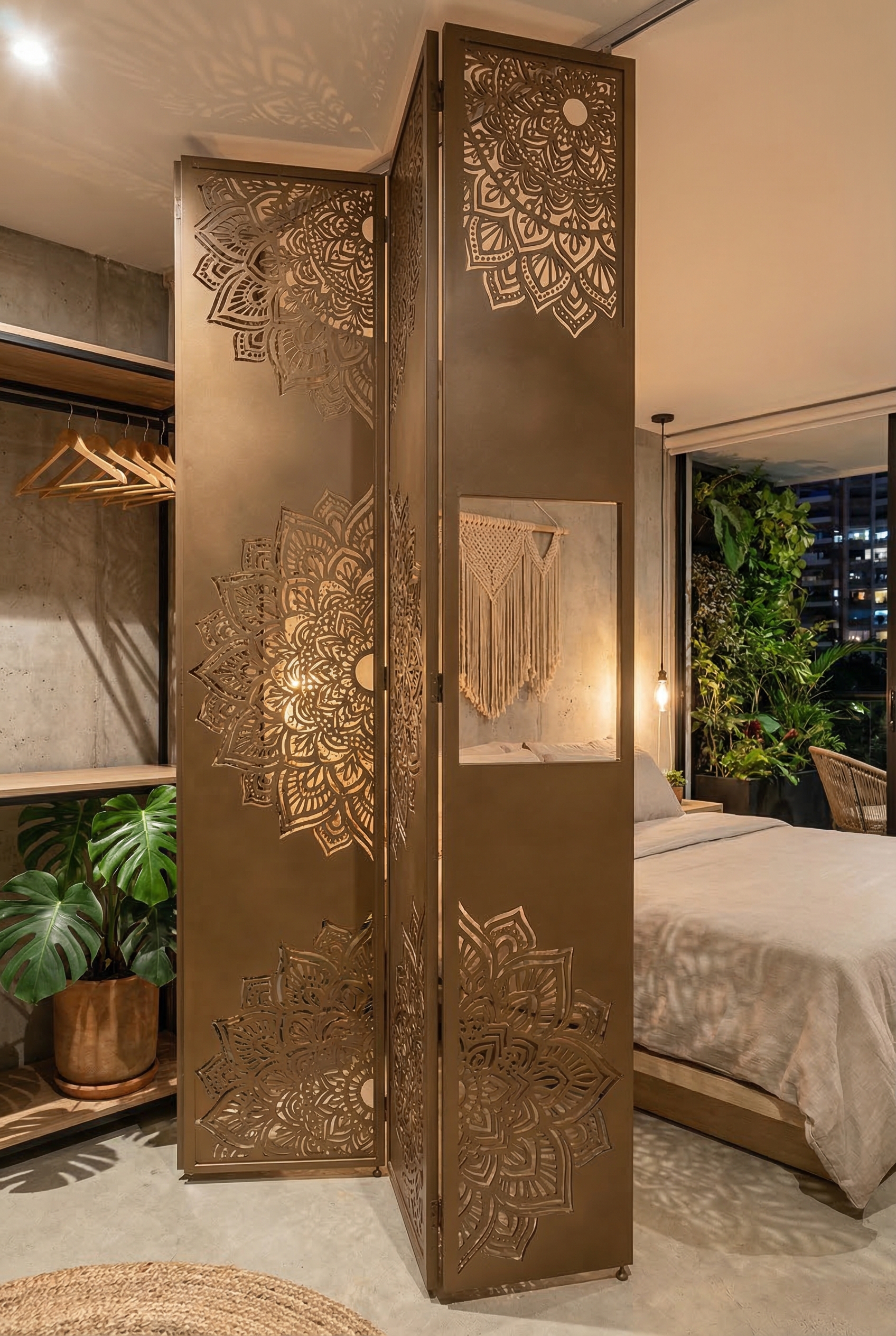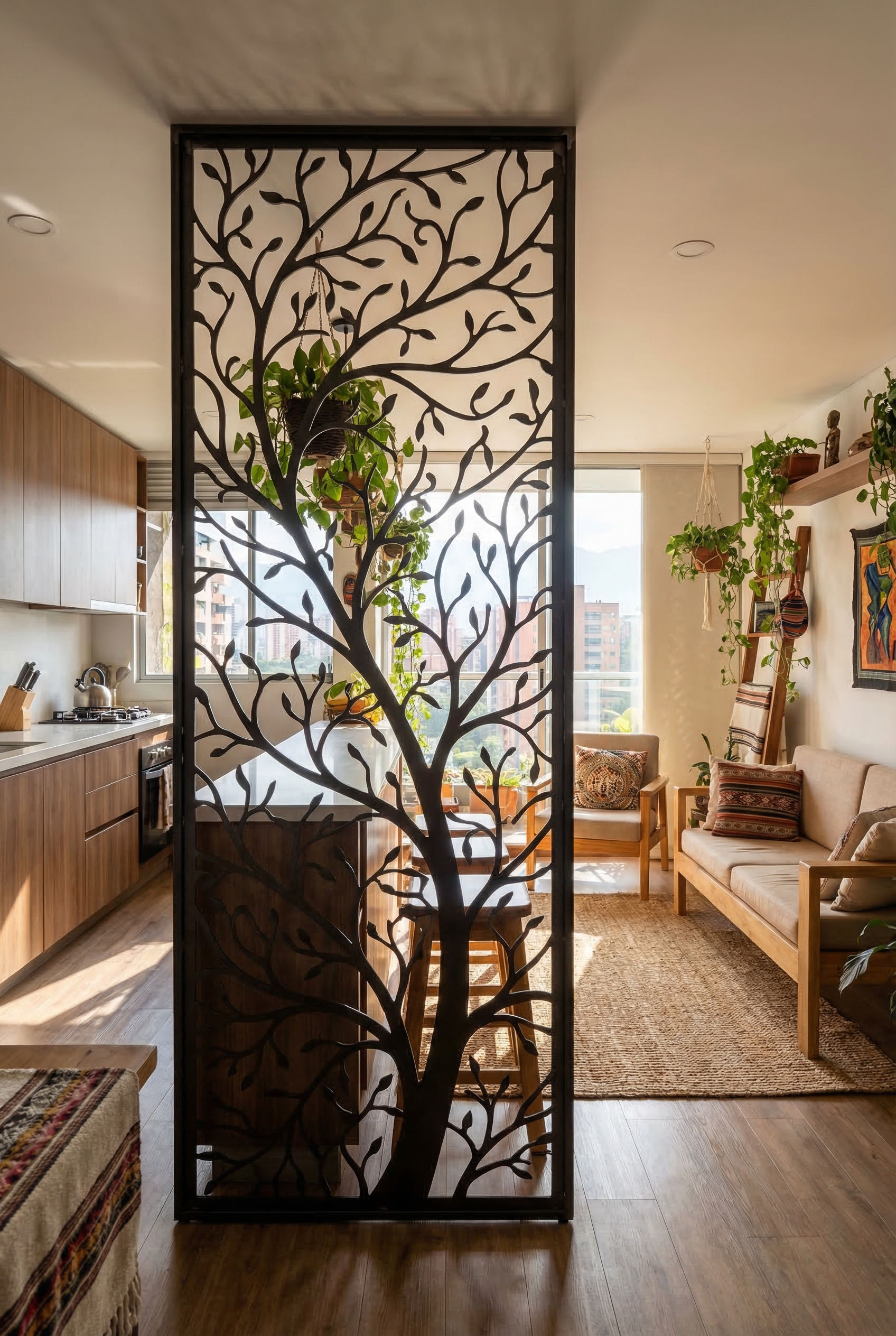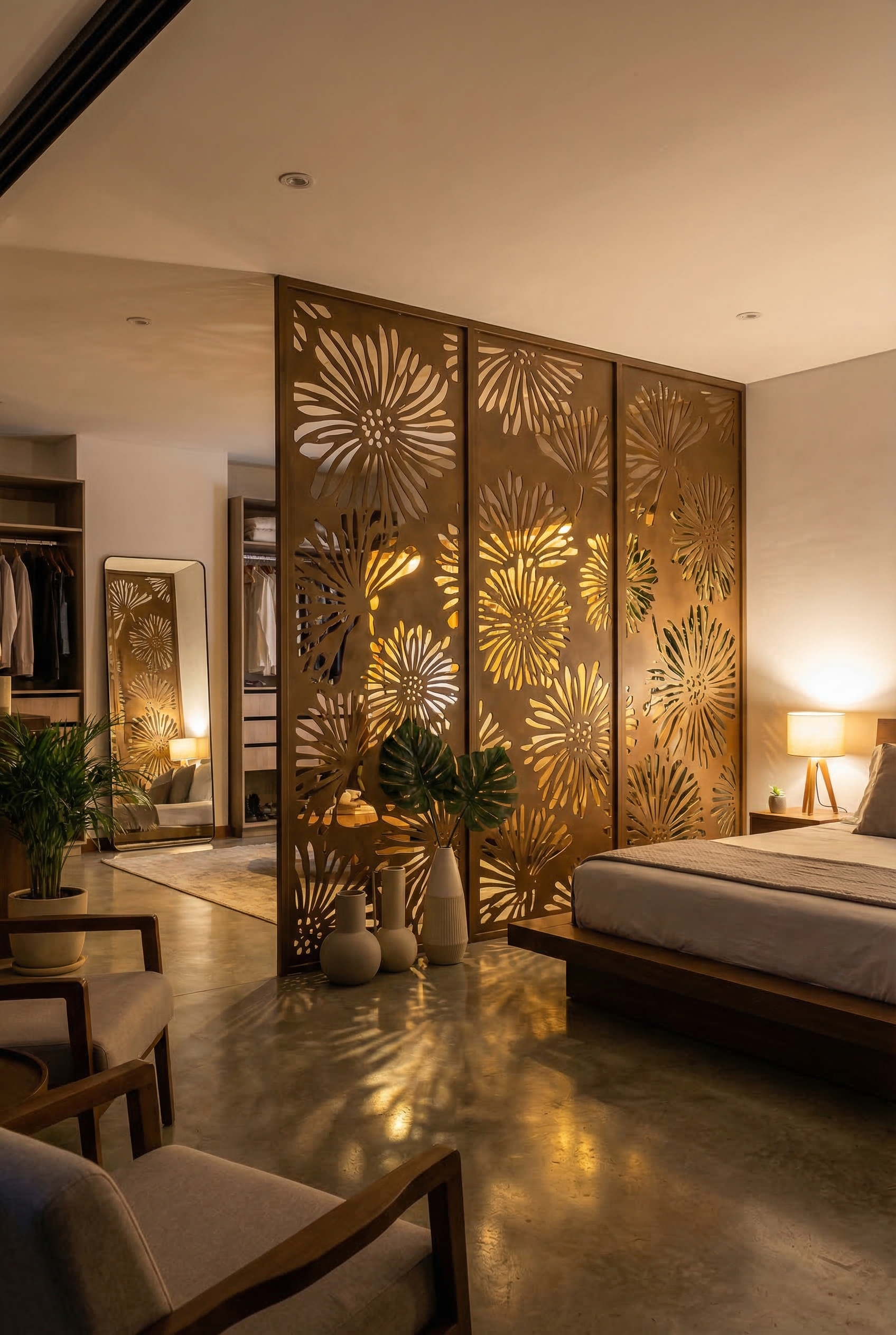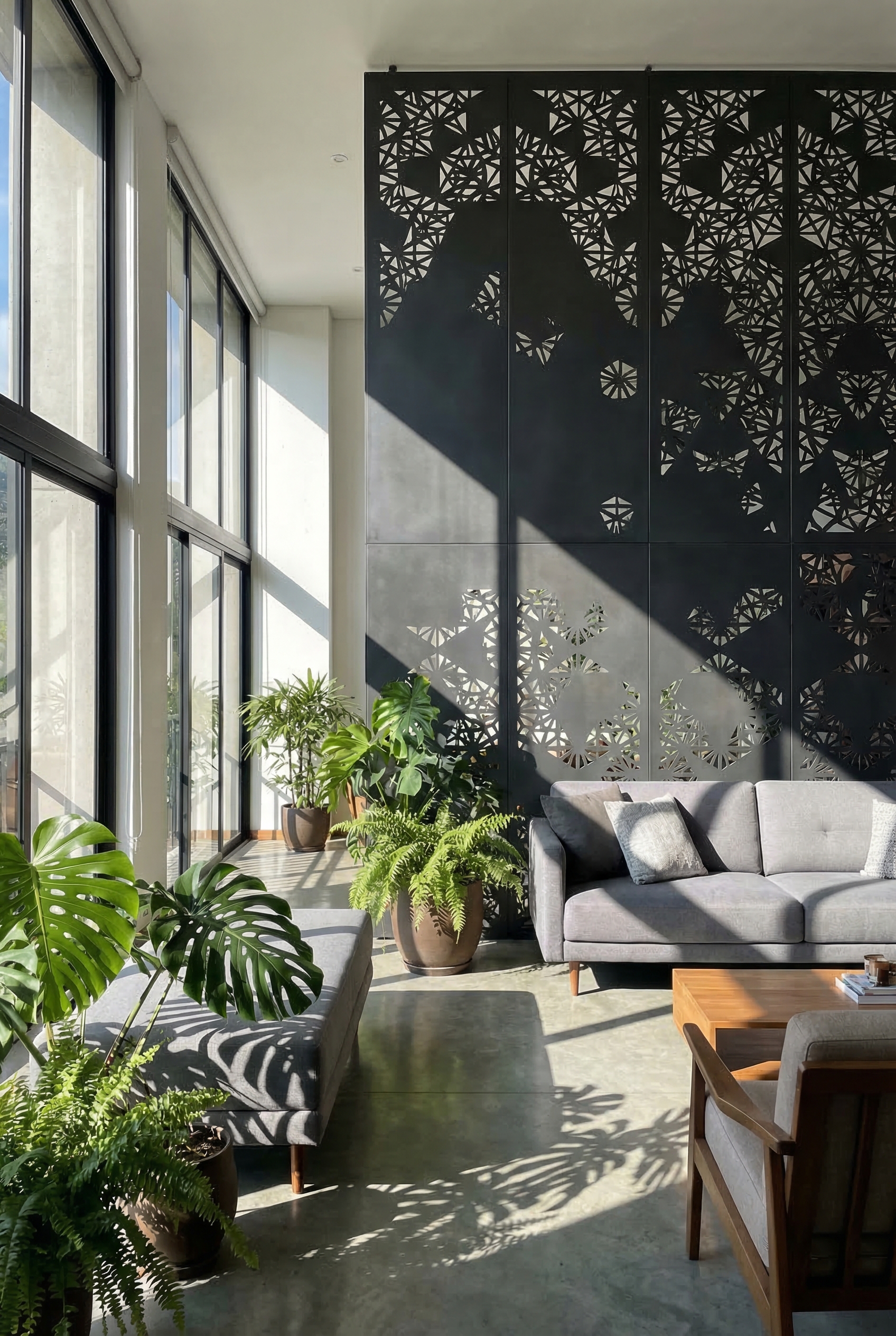 Los biombos y separadores metálicos permiten transformar los espacios sin necesidad de muros permanentes. Diseñamos y fabricamos paneles con patrones de corte láser únicos, inspirados en geometría, naturaleza y arte contemporáneo, que filtran la luz y crean juegos de sombras elegantes. Estas piezas funcionan como elementos arquitectónicos y decorativos que aportan identidad a hogares, oficinas, restaurantes y proyectos comerciales.