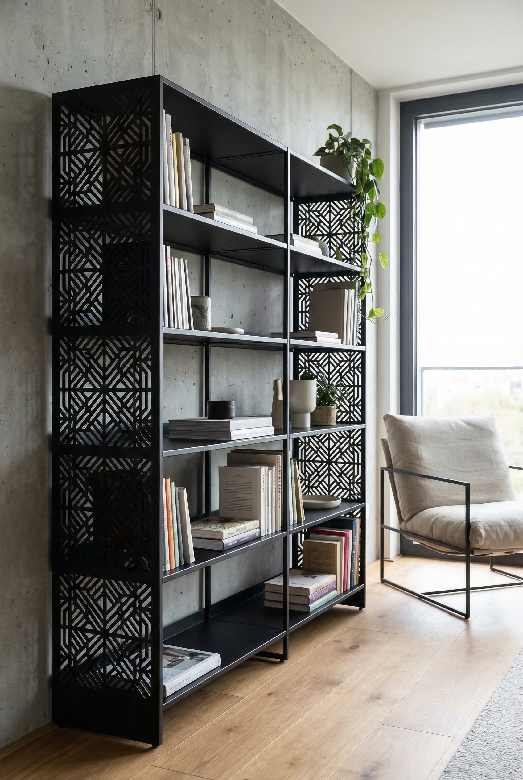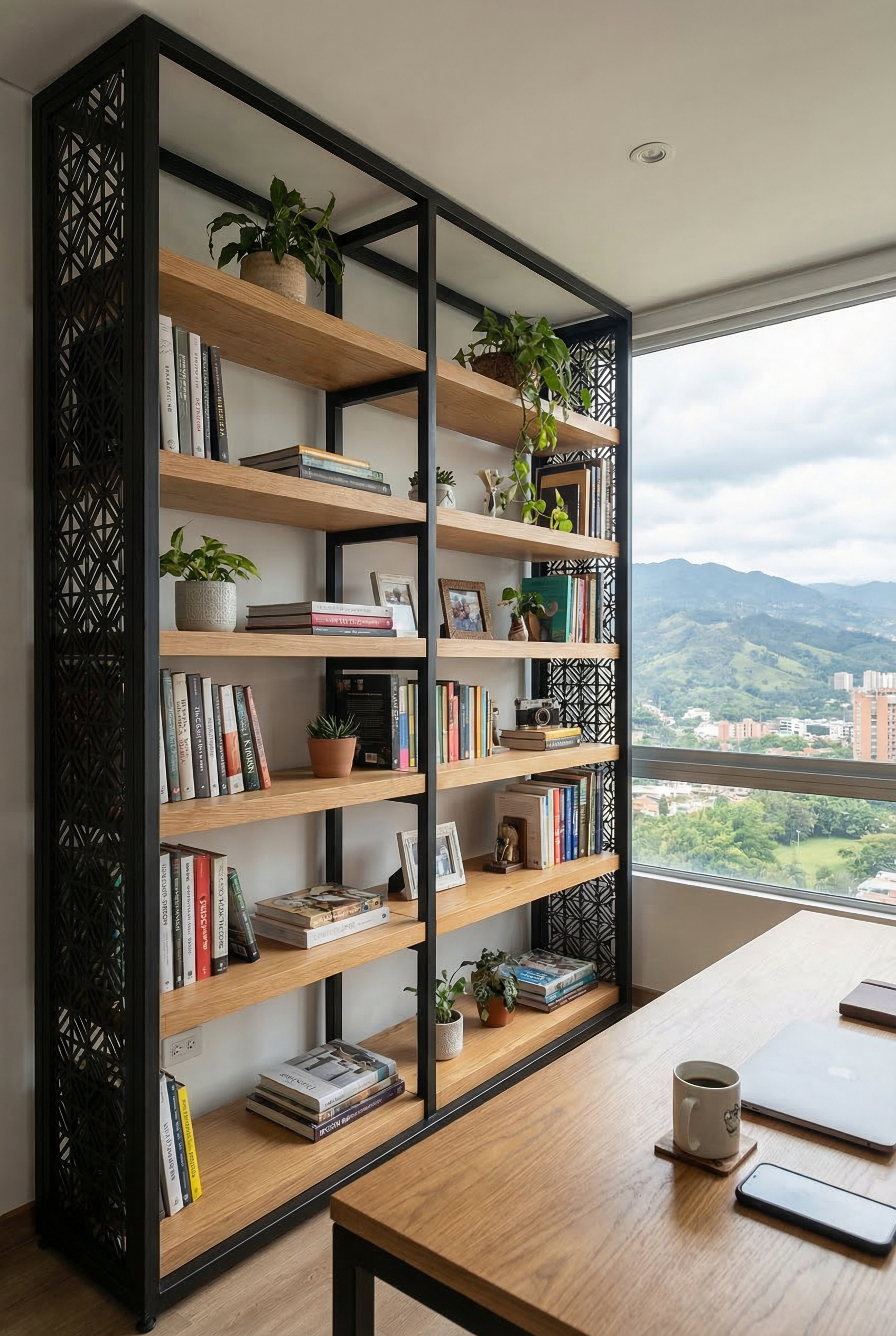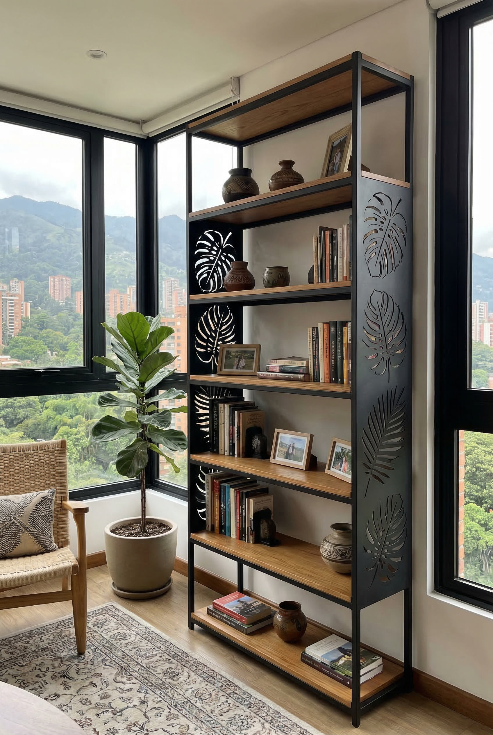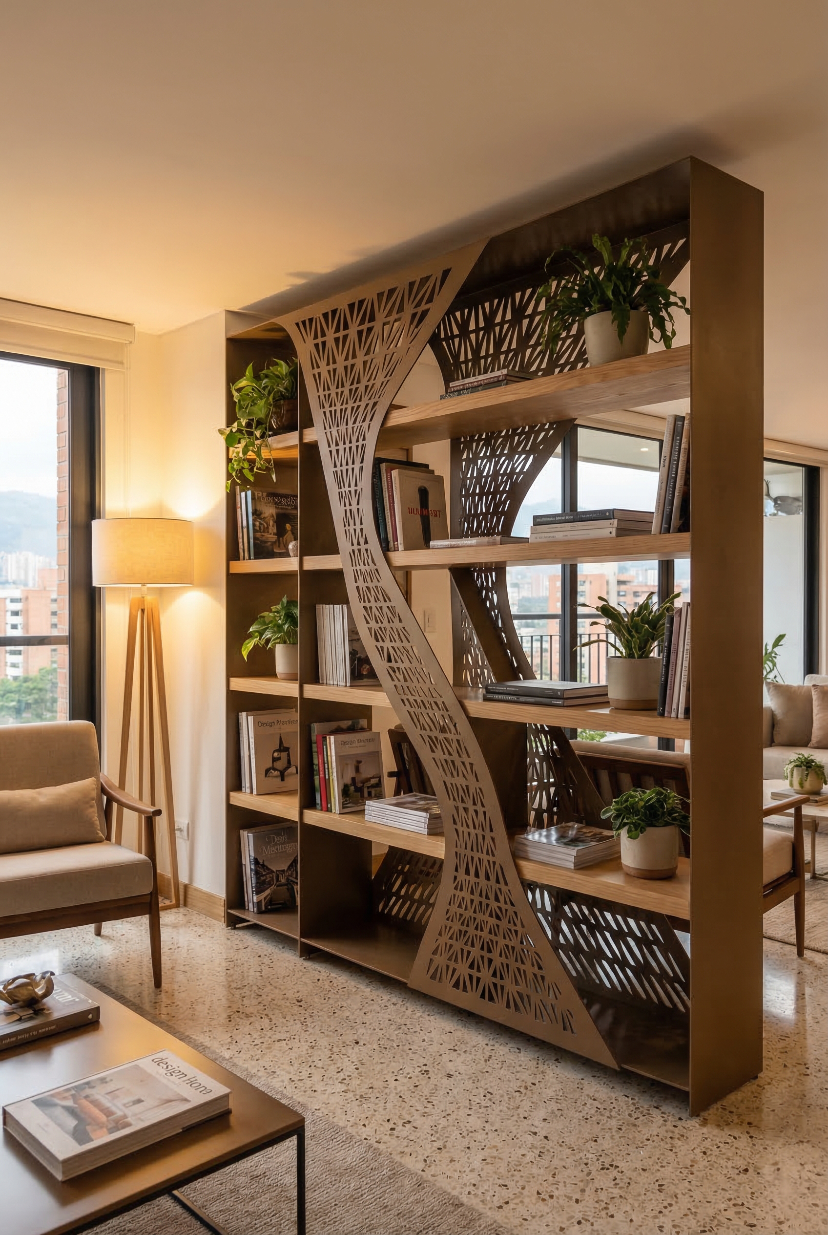 Nuestras bibliotecas están diseñadas para transformar cualquier espacio en un ambiente sofisticado y organizado. Combinamos metal trabajado con precisión, madera y diseños de corte láser que aportan personalidad y carácter. Cada pieza busca equilibrar funcionalidad y estética, creando muebles ideales para libros, objetos decorativos y obras de arte, pensados para hogares modernos que valoran el diseño.