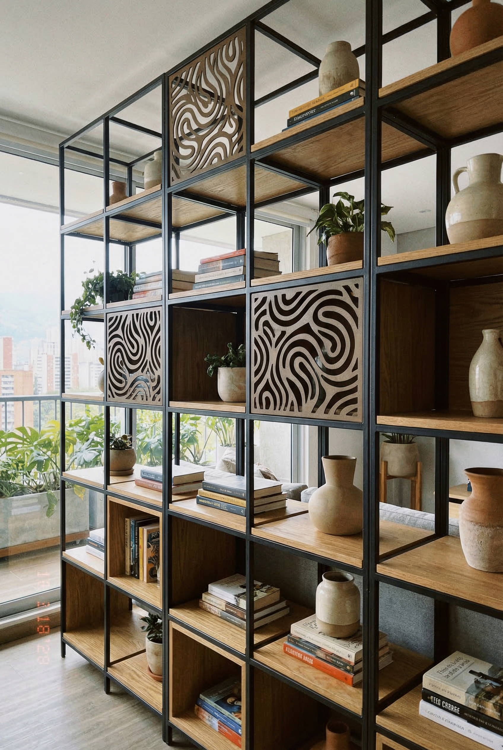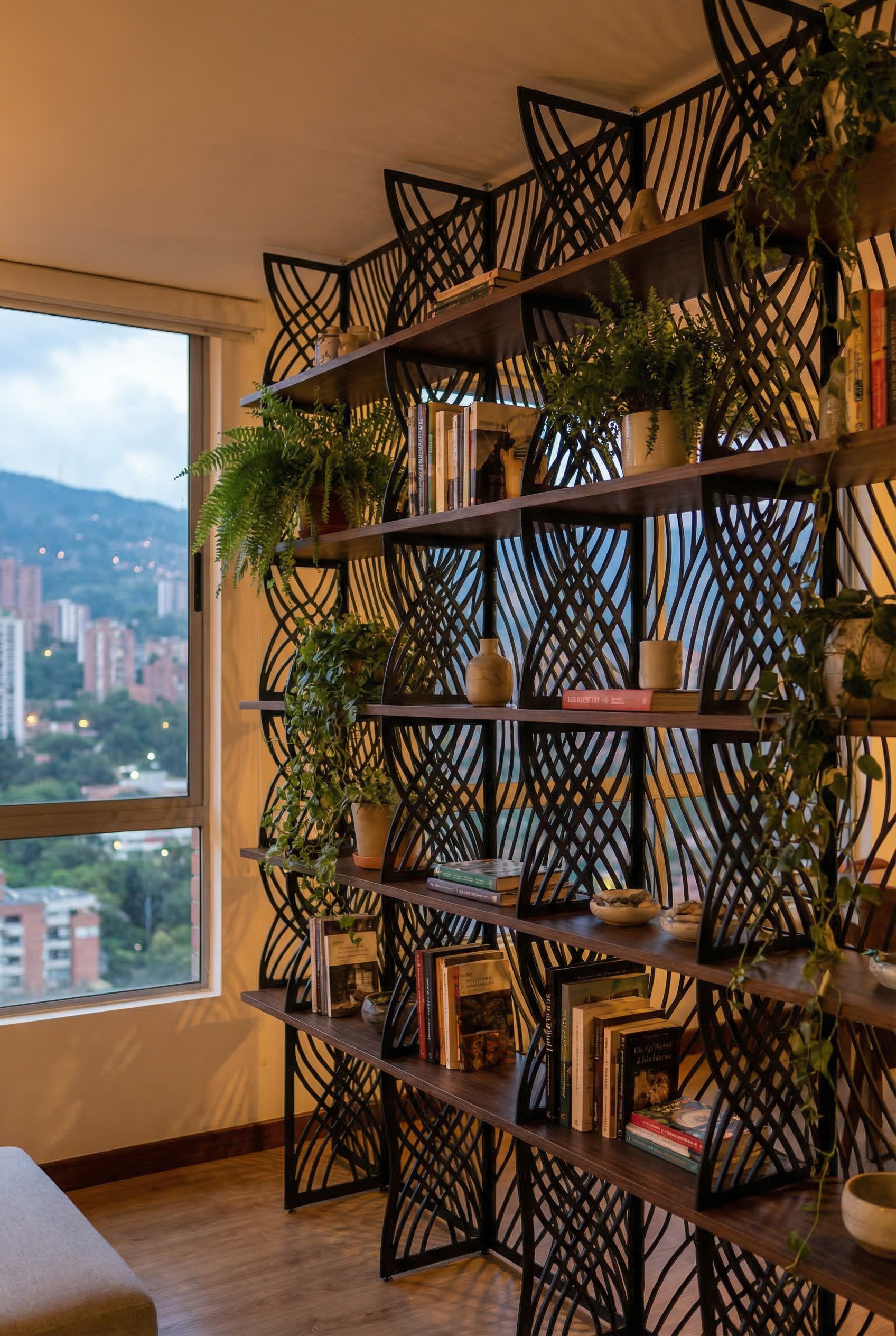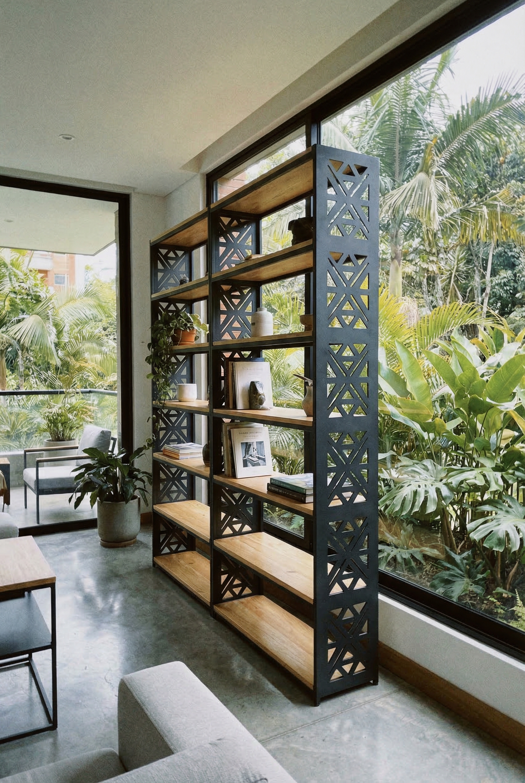 Nuestras bibliotecas están diseñadas para transformar cualquier espacio en un ambiente sofisticado y organizado. Combinamos metal trabajado con precisión, madera y diseños de corte láser que aportan personalidad y carácter. Cada pieza busca equilibrar funcionalidad y estética, creando muebles ideales para libros, objetos decorativos y obras de arte, pensados para hogares modernos que valoran el diseño.