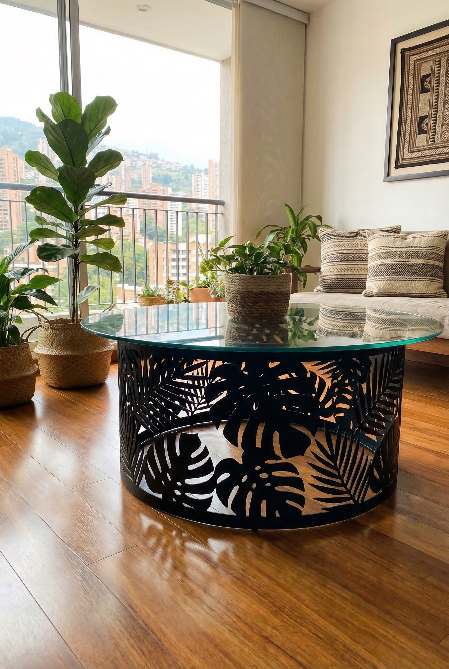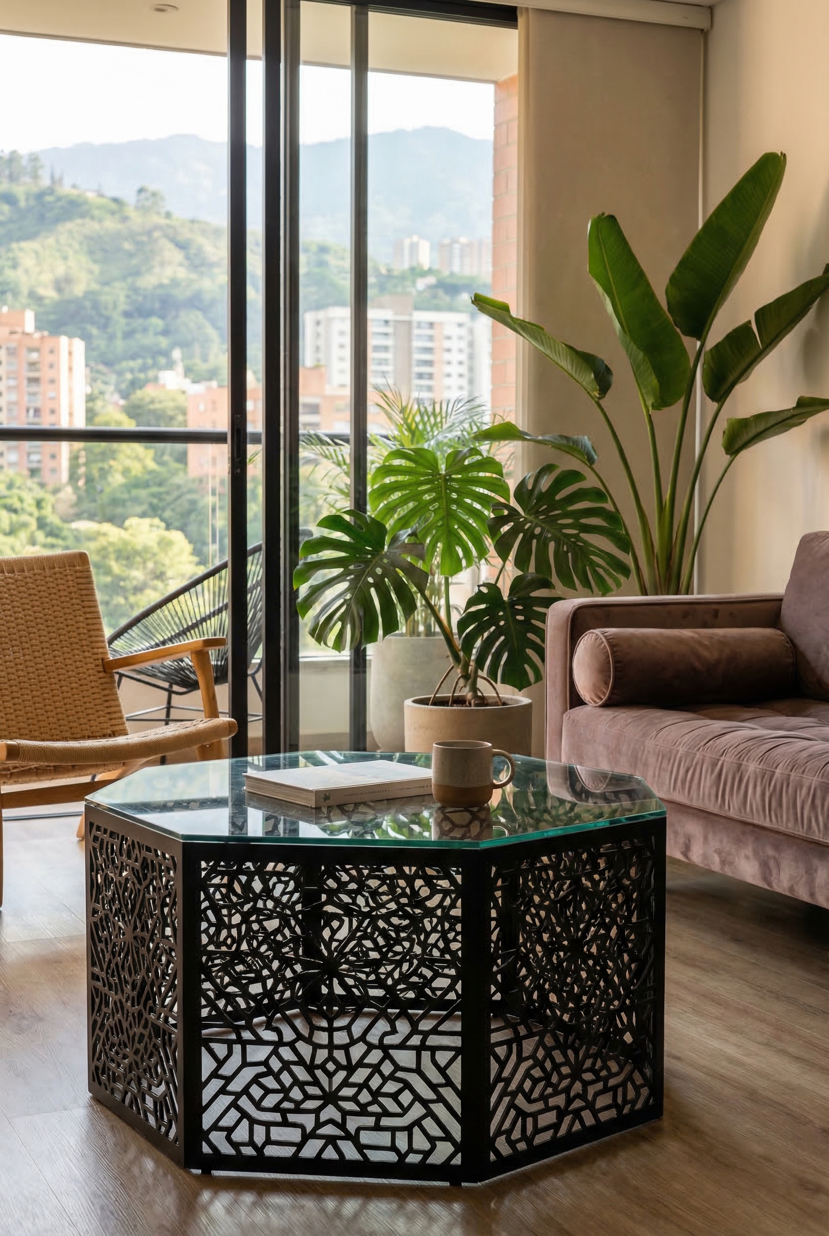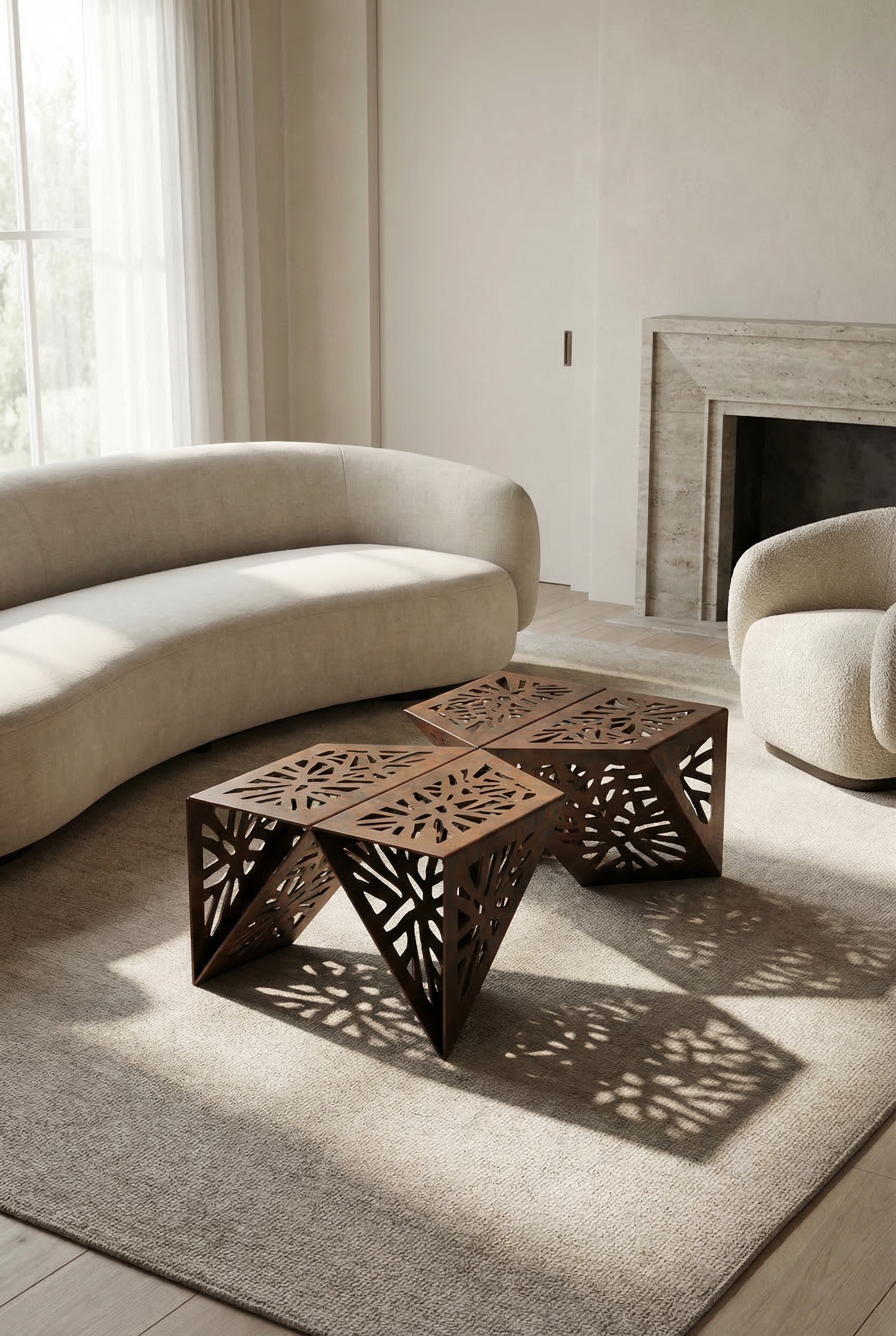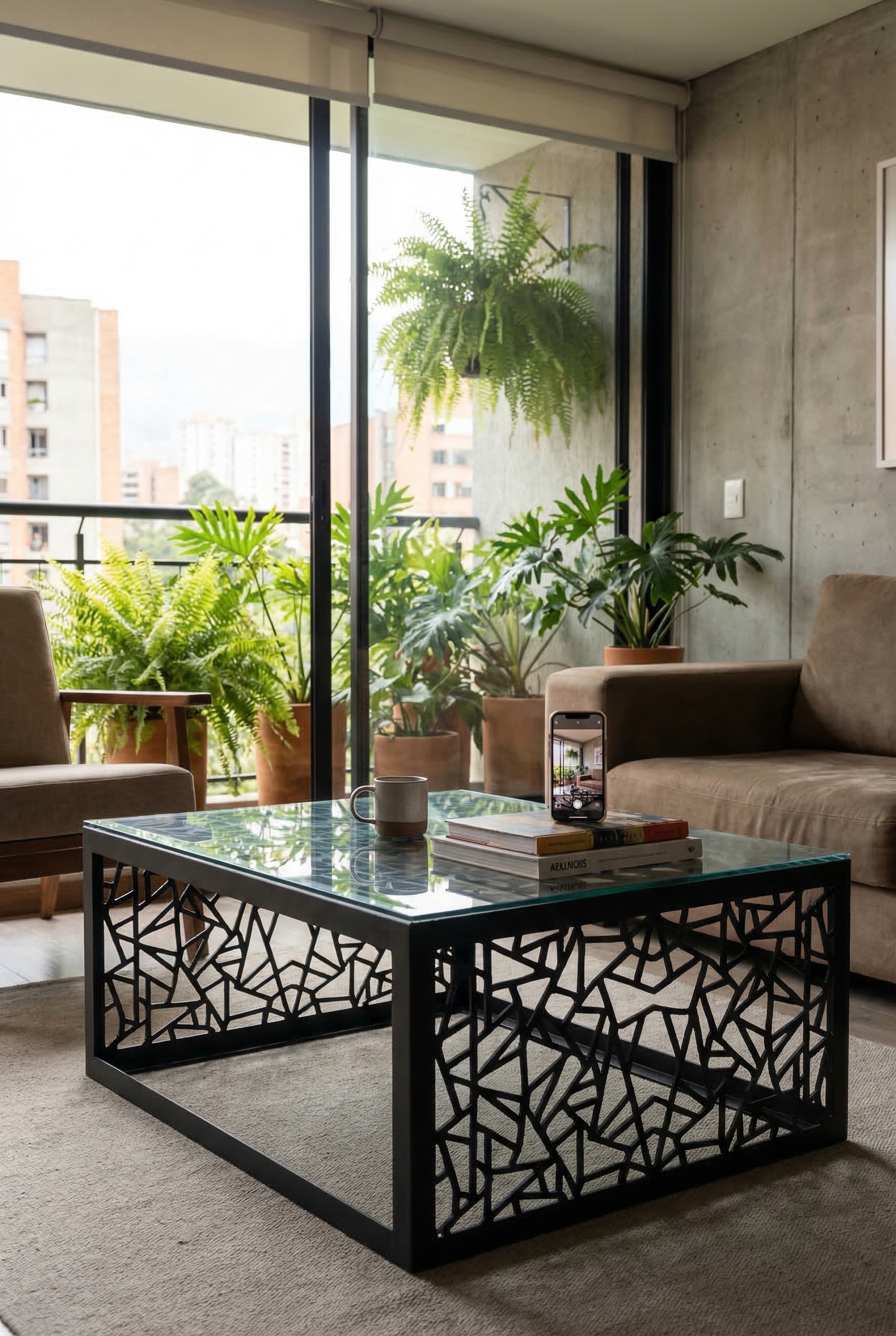 Nuestras mesas de centro están diseñadas para convertirse en el elemento protagonista de cualquier sala. Combinamos metal trabajado con precisión, diseños de corte láser y materiales como madera, vidrio o piedra para crear piezas elegantes y contemporáneas. Cada mesa es pensada como una obra funcional que aporta carácter al espacio, integrando geometría, arte y diseño moderno en ambientes sofisticados.