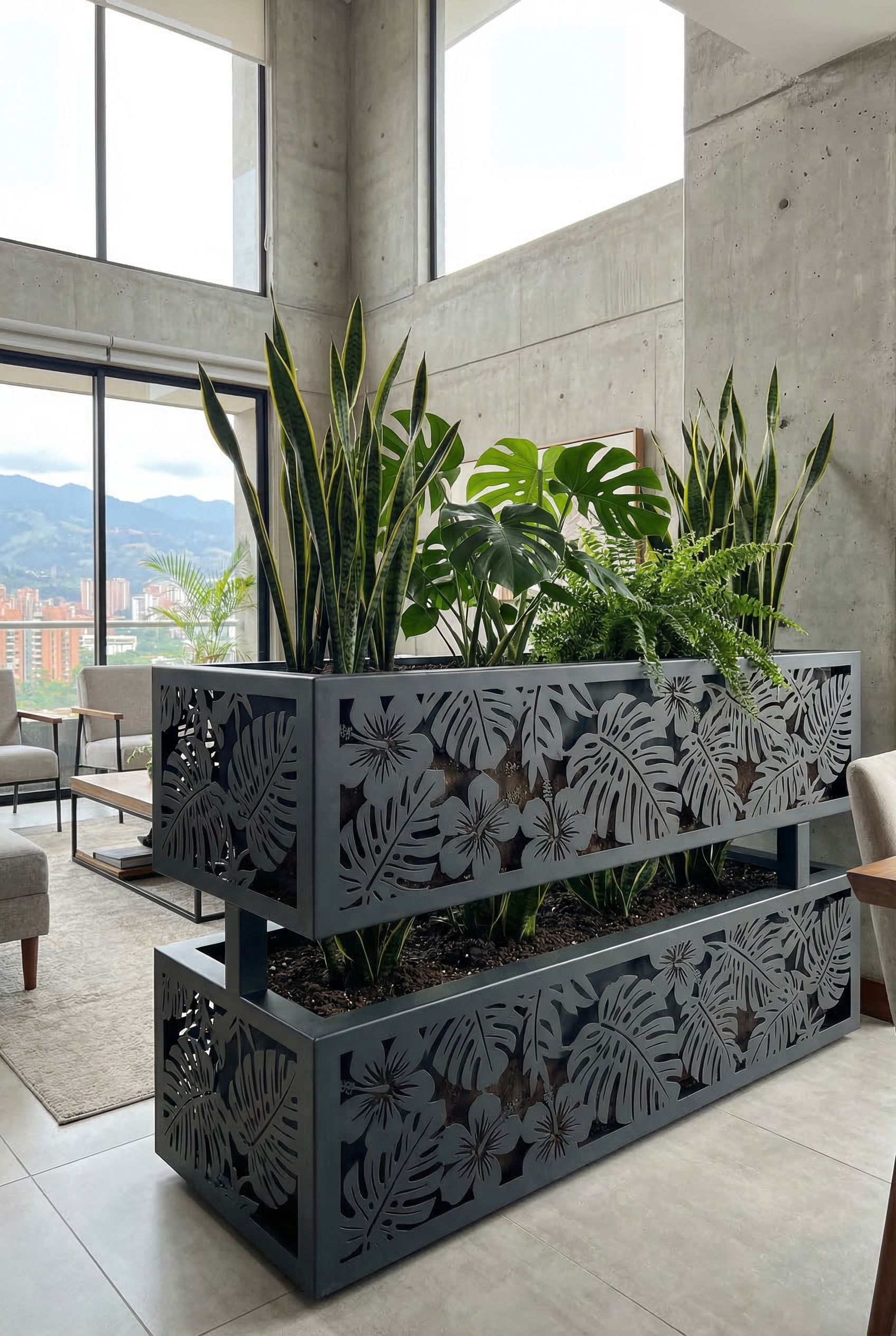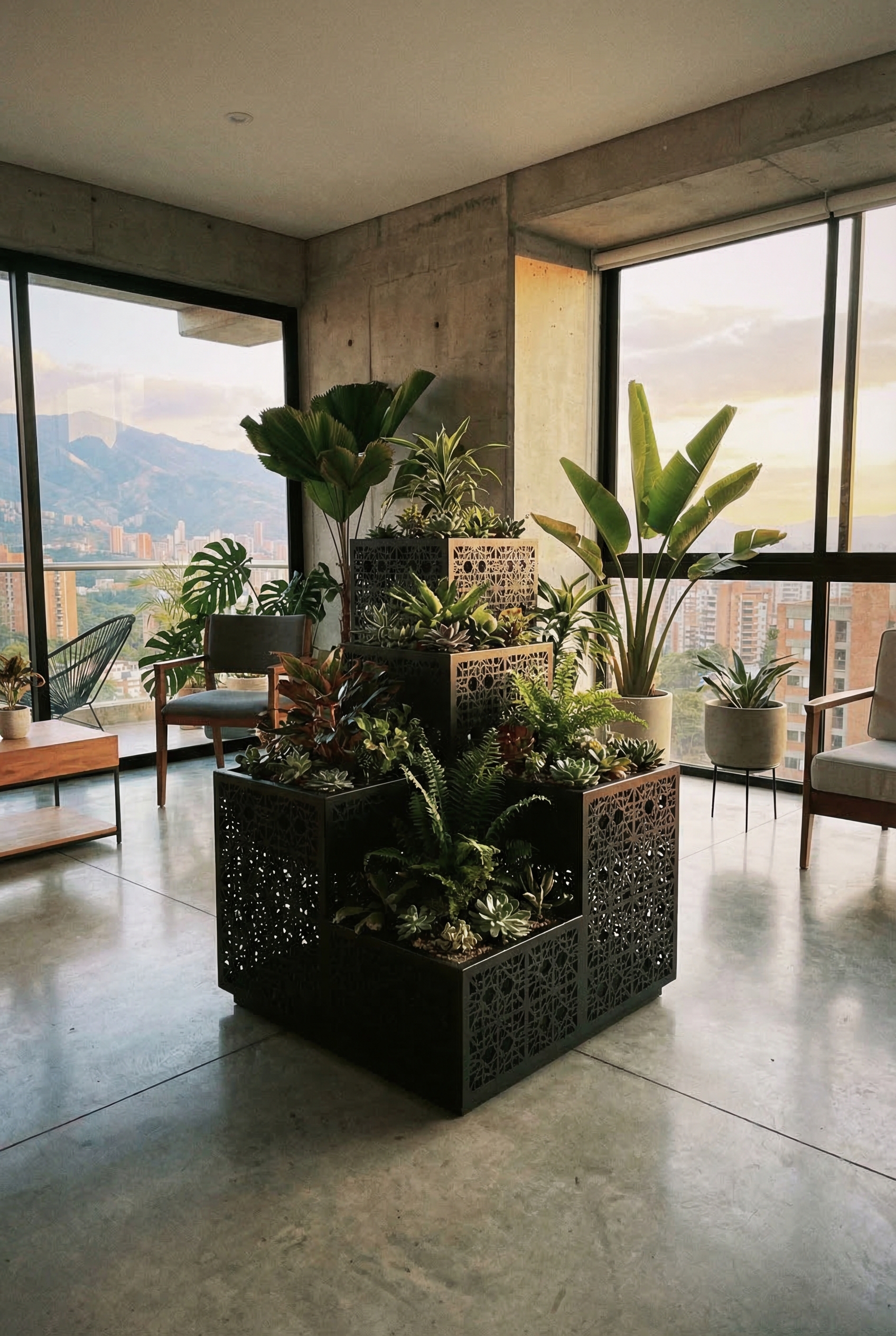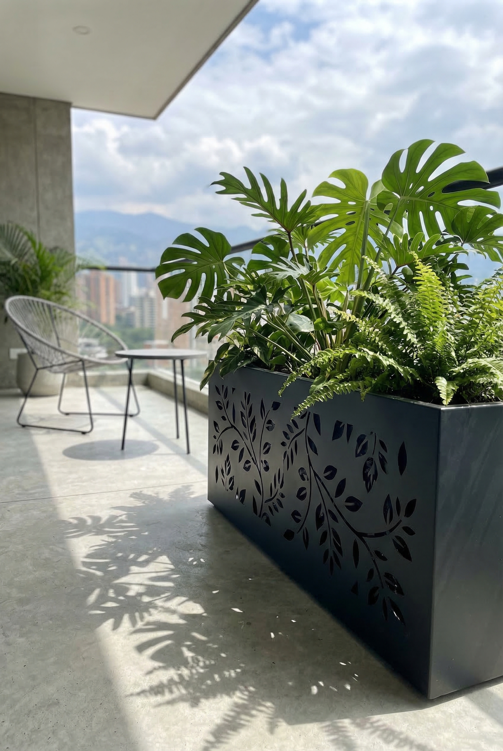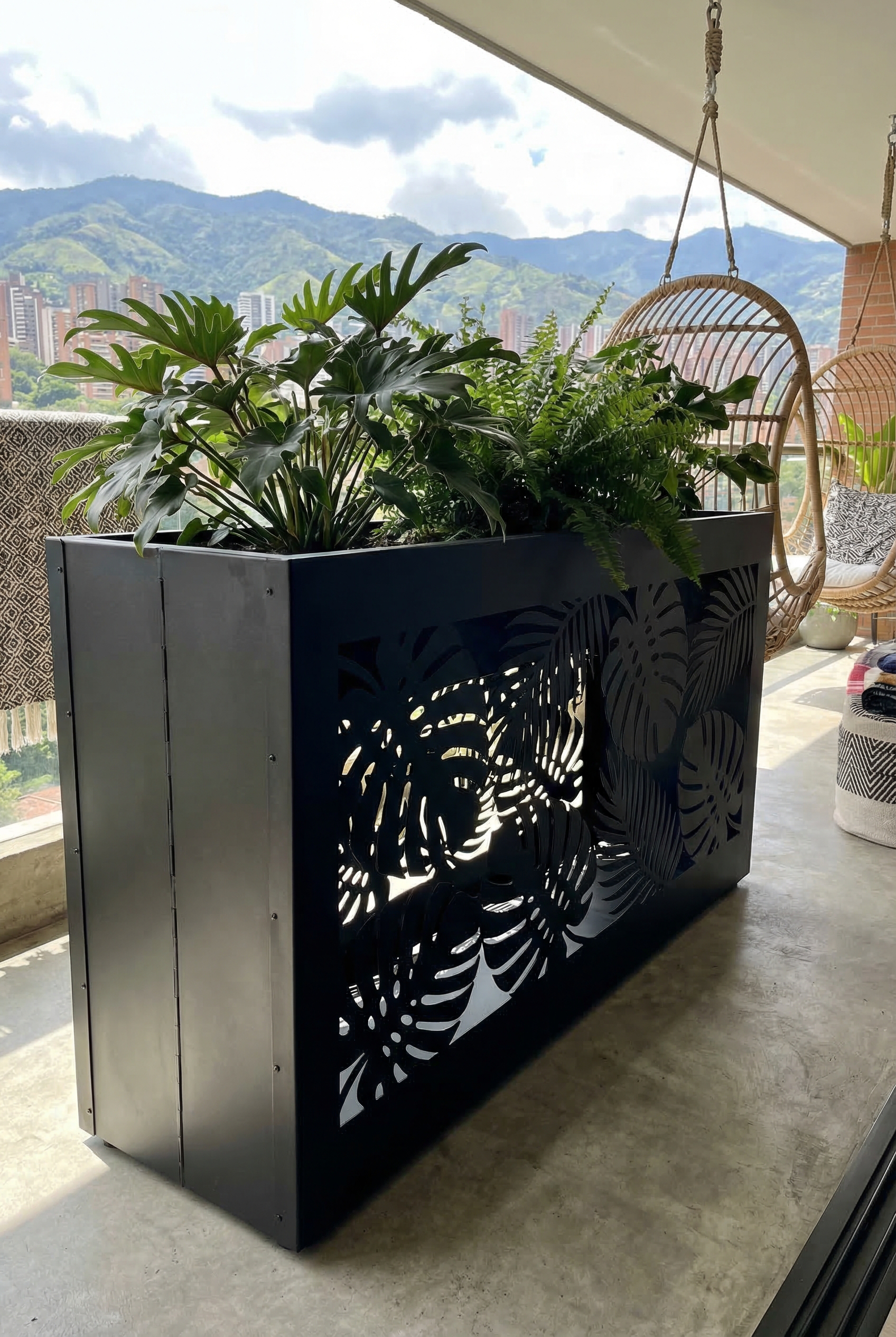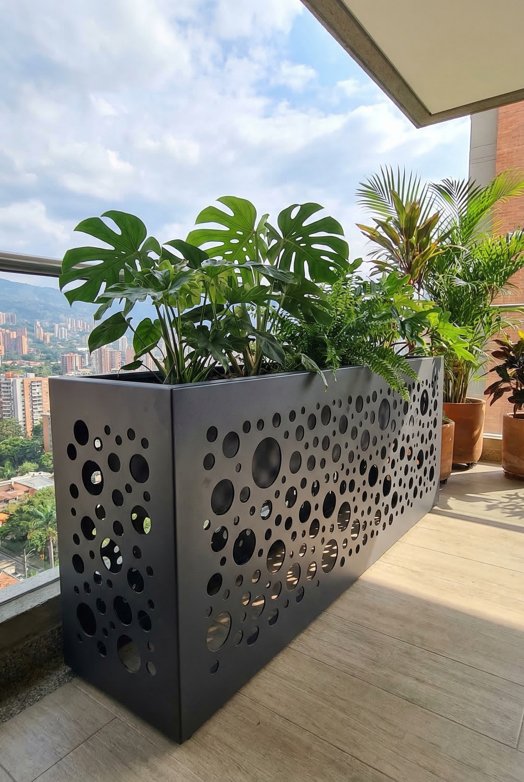 Nuestras macetas y estructuras metálicas para plantas combinan diseño arquitectónico, corte láser decorativo y fabricación de alta precisión. Cada pieza está diseñada con caras planas y geometrías limpias, ideales para procesos de corte y doblado, permitiendo integrar patrones botánicos, geométricos o artísticos que aportan carácter al espacio. Estas piezas funcionan tanto como contenedores para plantas como elementos decorativos que transforman balcones, interiores, oficinas y terrazas en ambientes modernos y naturales.