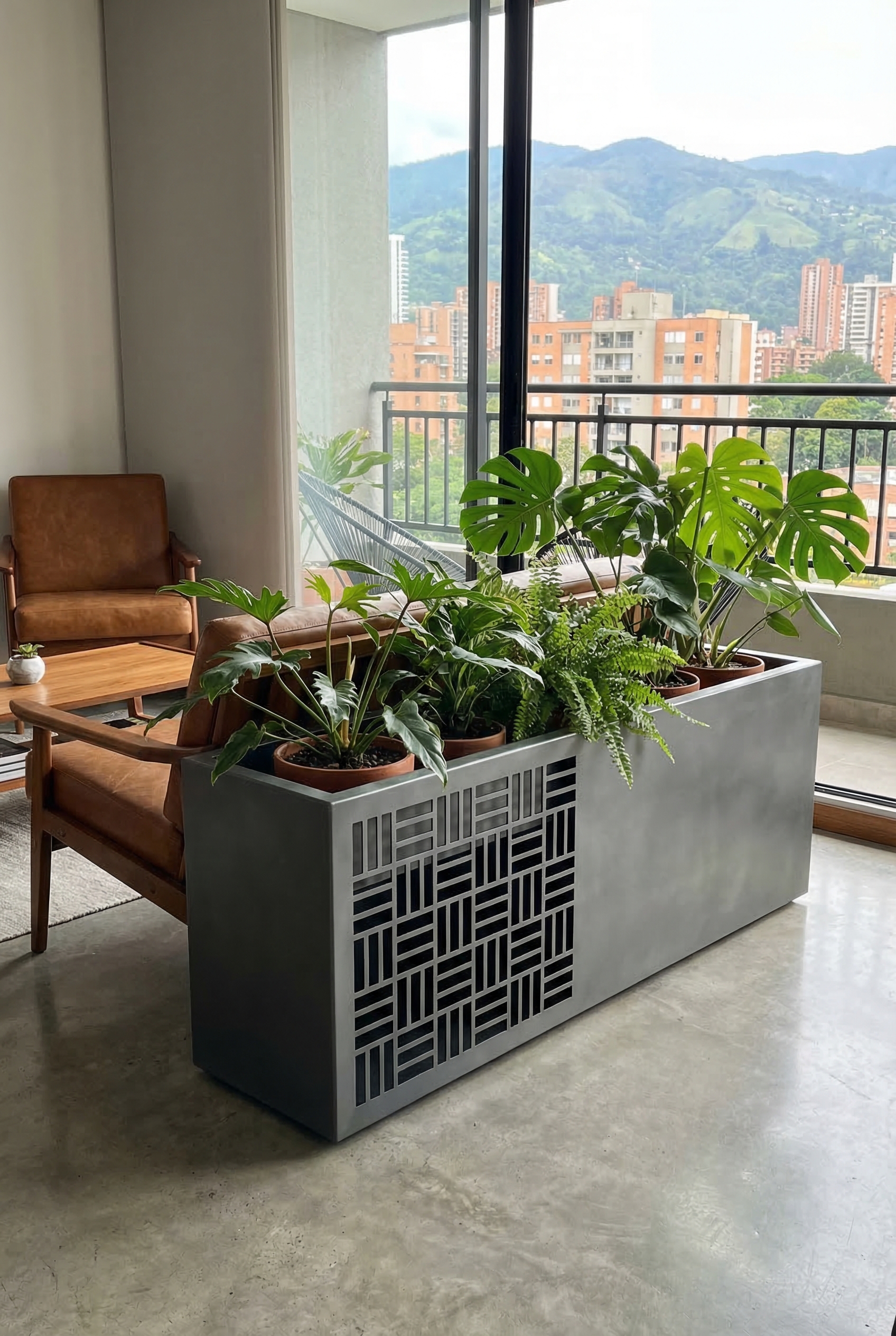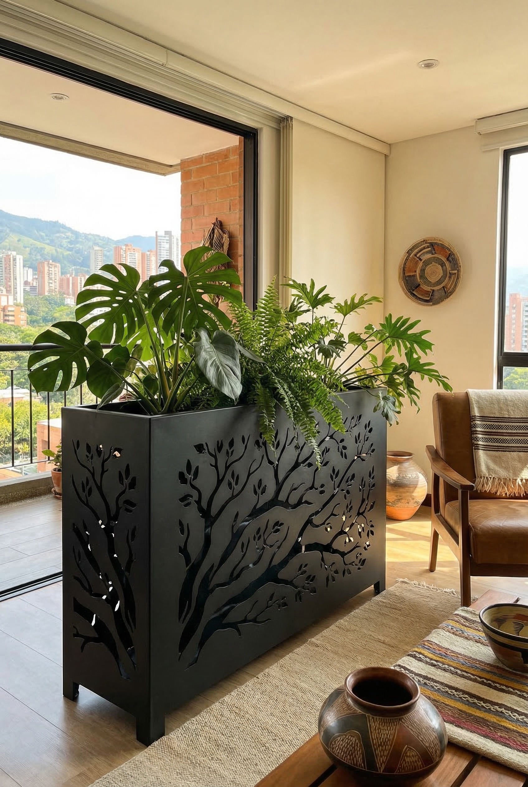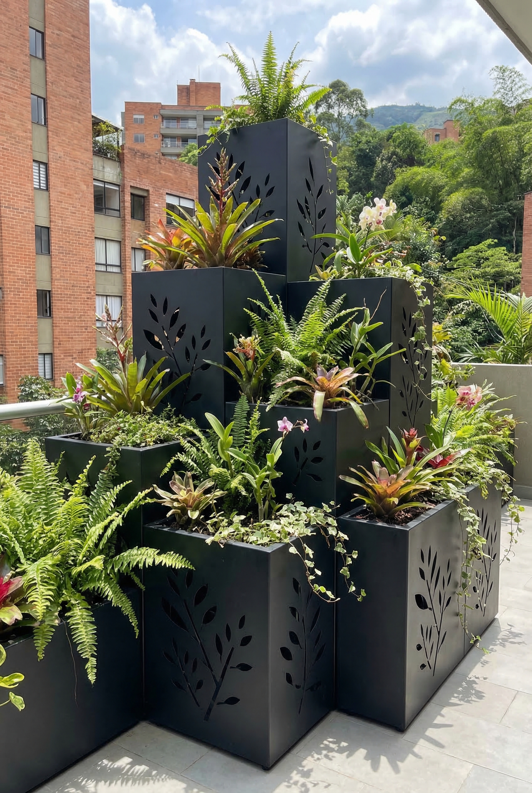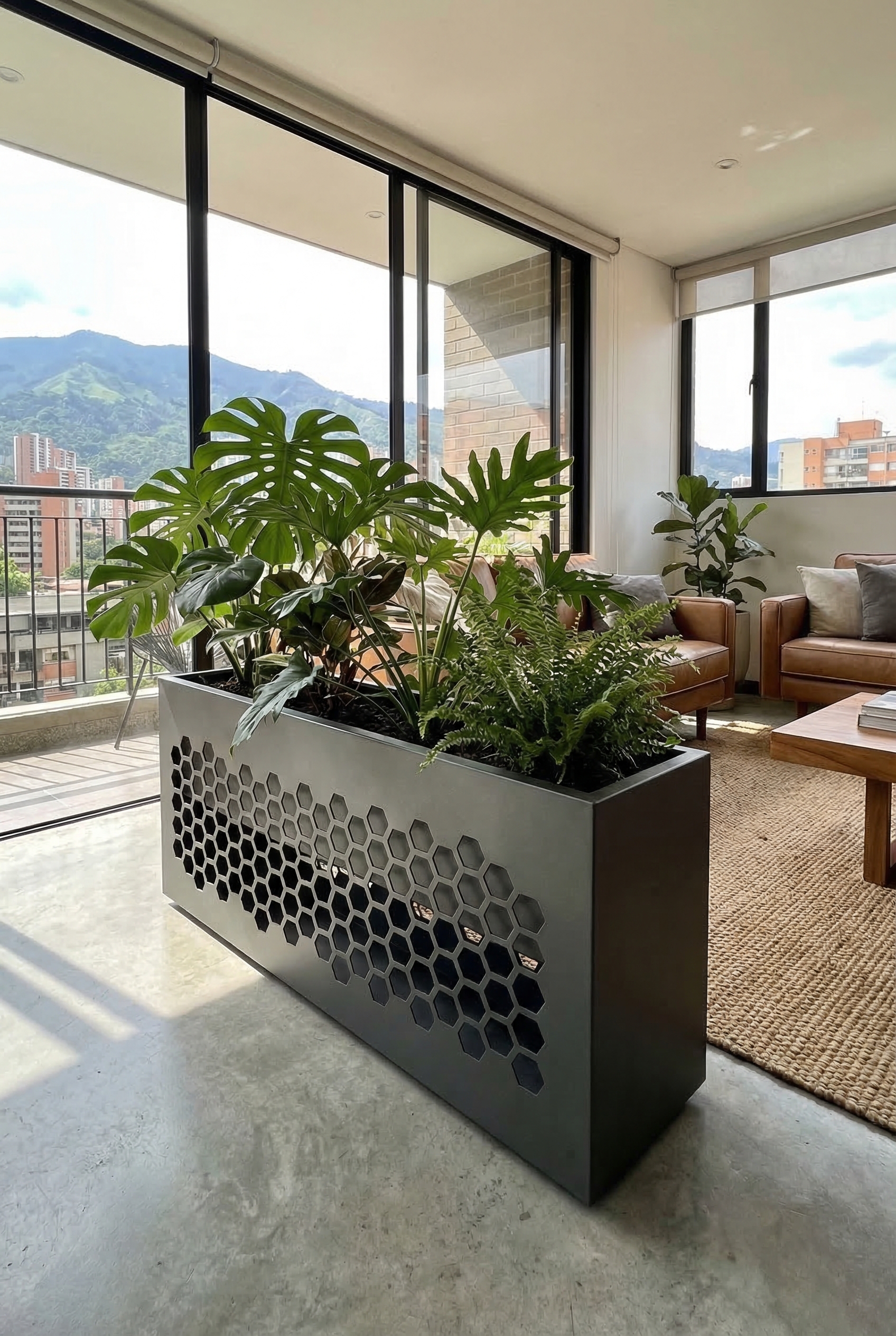 Nuestras macetas y estructuras metálicas para plantas combinan diseño arquitectónico, corte láser decorativo y fabricación de alta precisión. Cada pieza está diseñada con caras planas y geometrías limpias, ideales para procesos de corte y doblado, permitiendo integrar patrones botánicos, geométricos o artísticos que aportan carácter al espacio. Estas piezas funcionan tanto como contenedores para plantas como elementos decorativos que transforman balcones, interiores, oficinas y terrazas en ambientes modernos y naturales.
