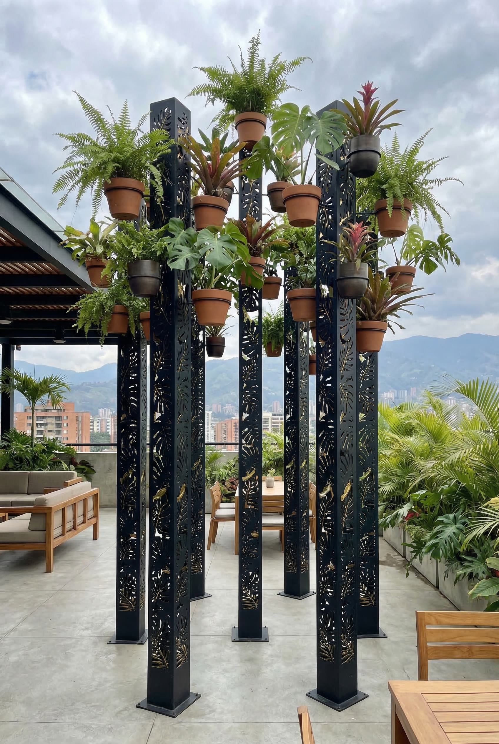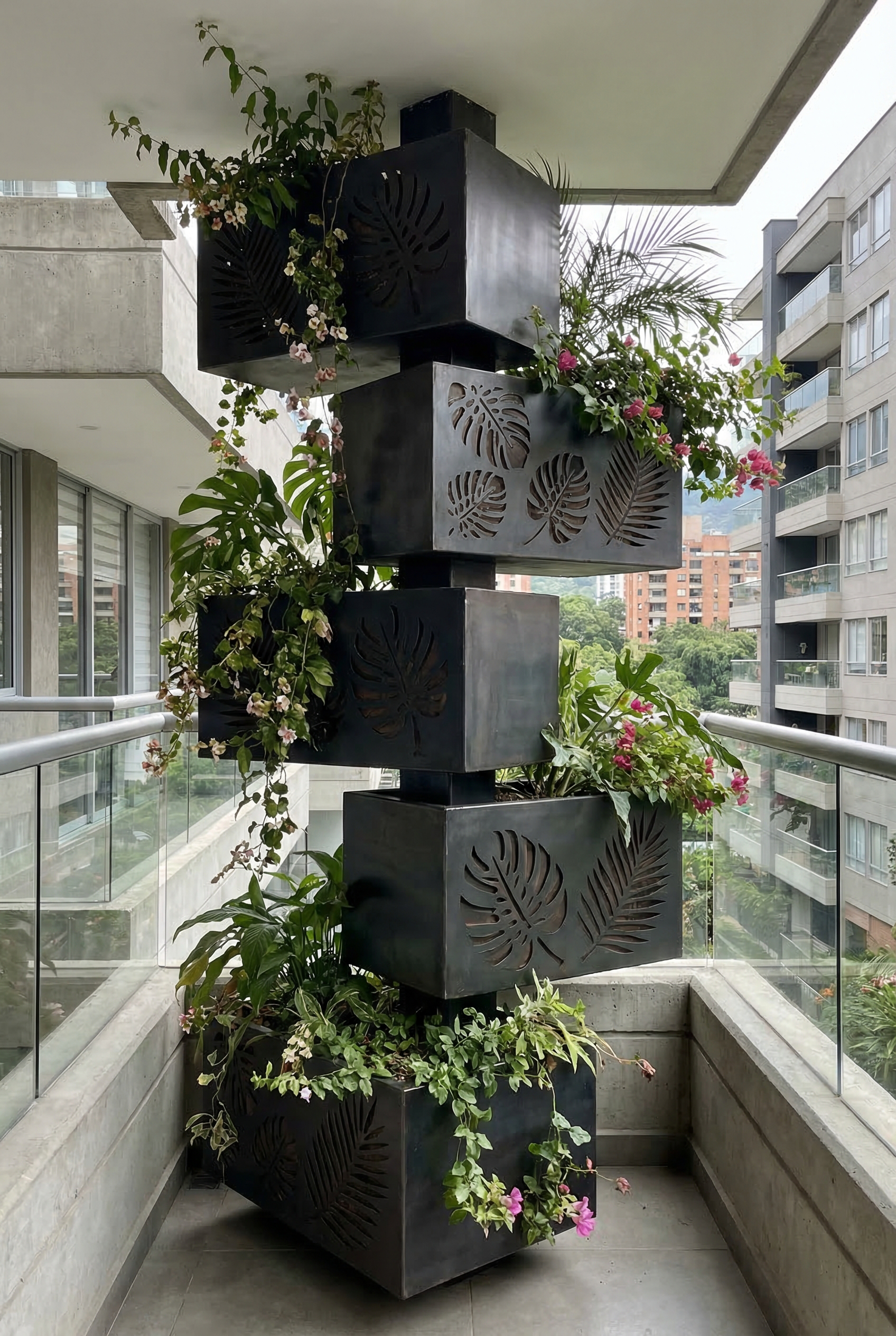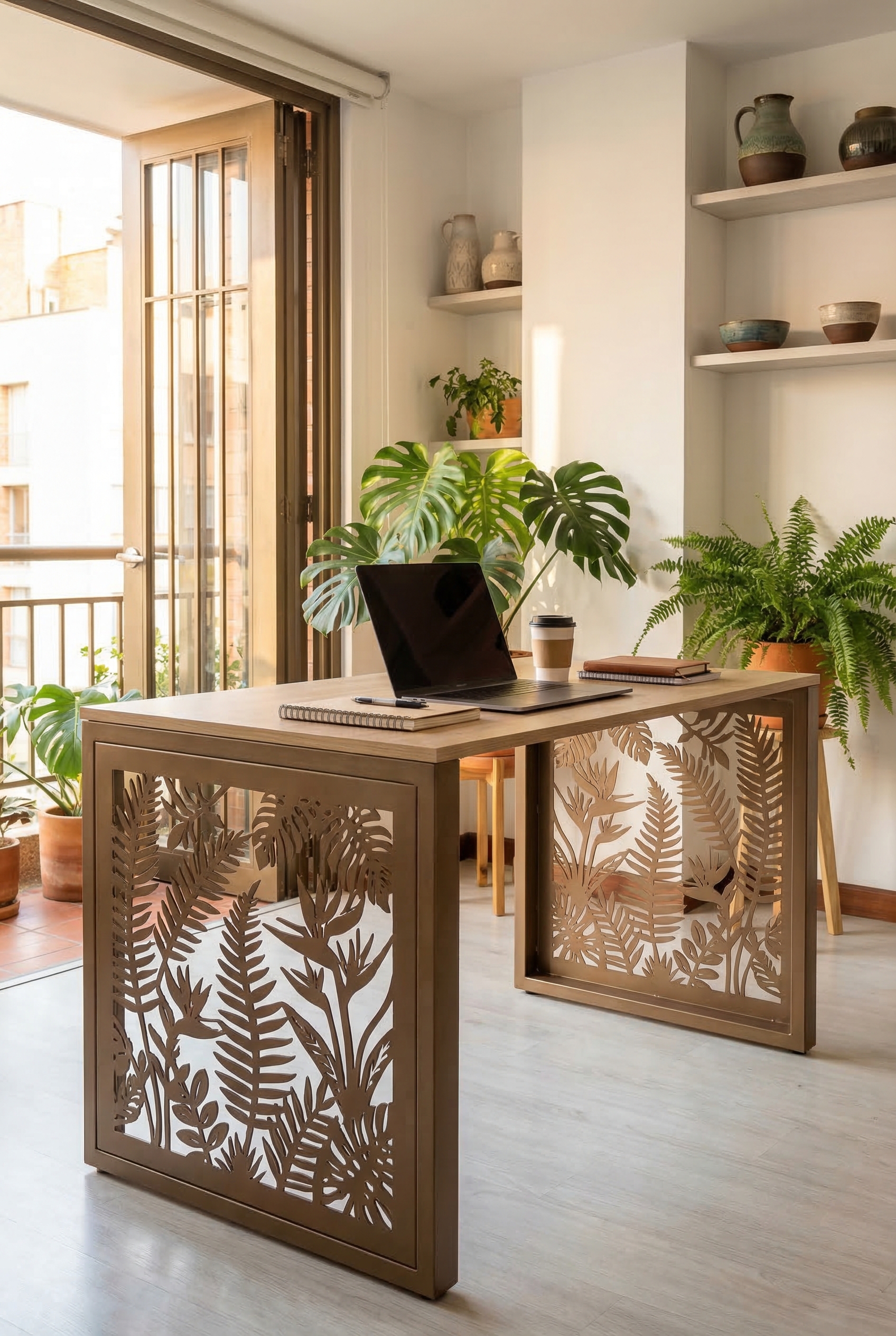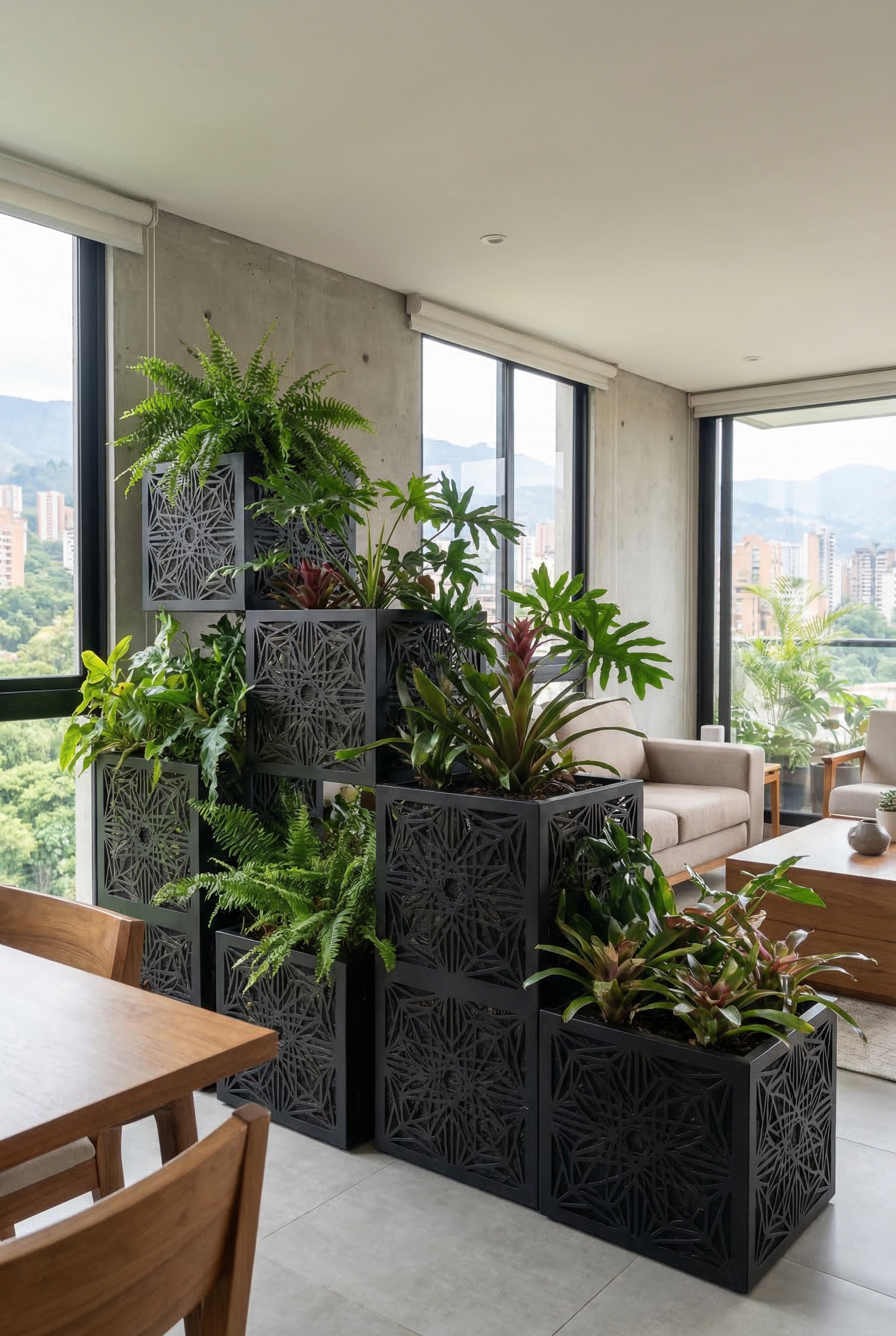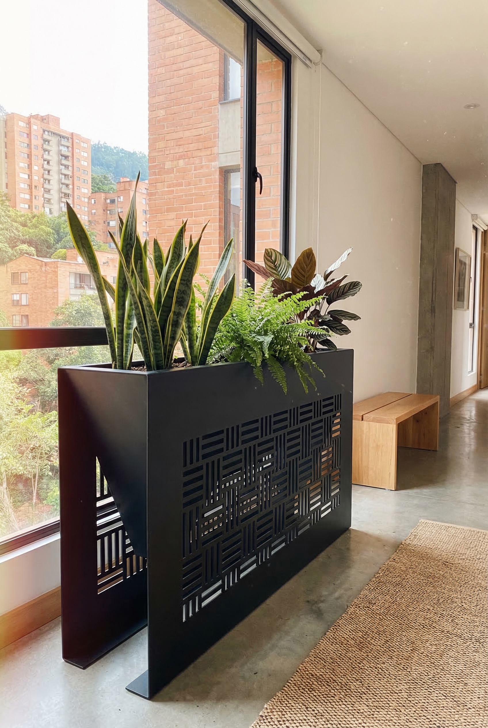 Nuestras macetas y estructuras metálicas para plantas combinan diseño arquitectónico, corte láser decorativo y fabricación de alta precisión. Cada pieza está diseñada con caras planas y geometrías limpias, ideales para procesos de corte y doblado, permitiendo integrar patrones botánicos, geométricos o artísticos que aportan carácter al espacio. Estas piezas funcionan tanto como contenedores para plantas como elementos decorativos que transforman balcones, interiores, oficinas y terrazas en ambientes modernos y naturales.
